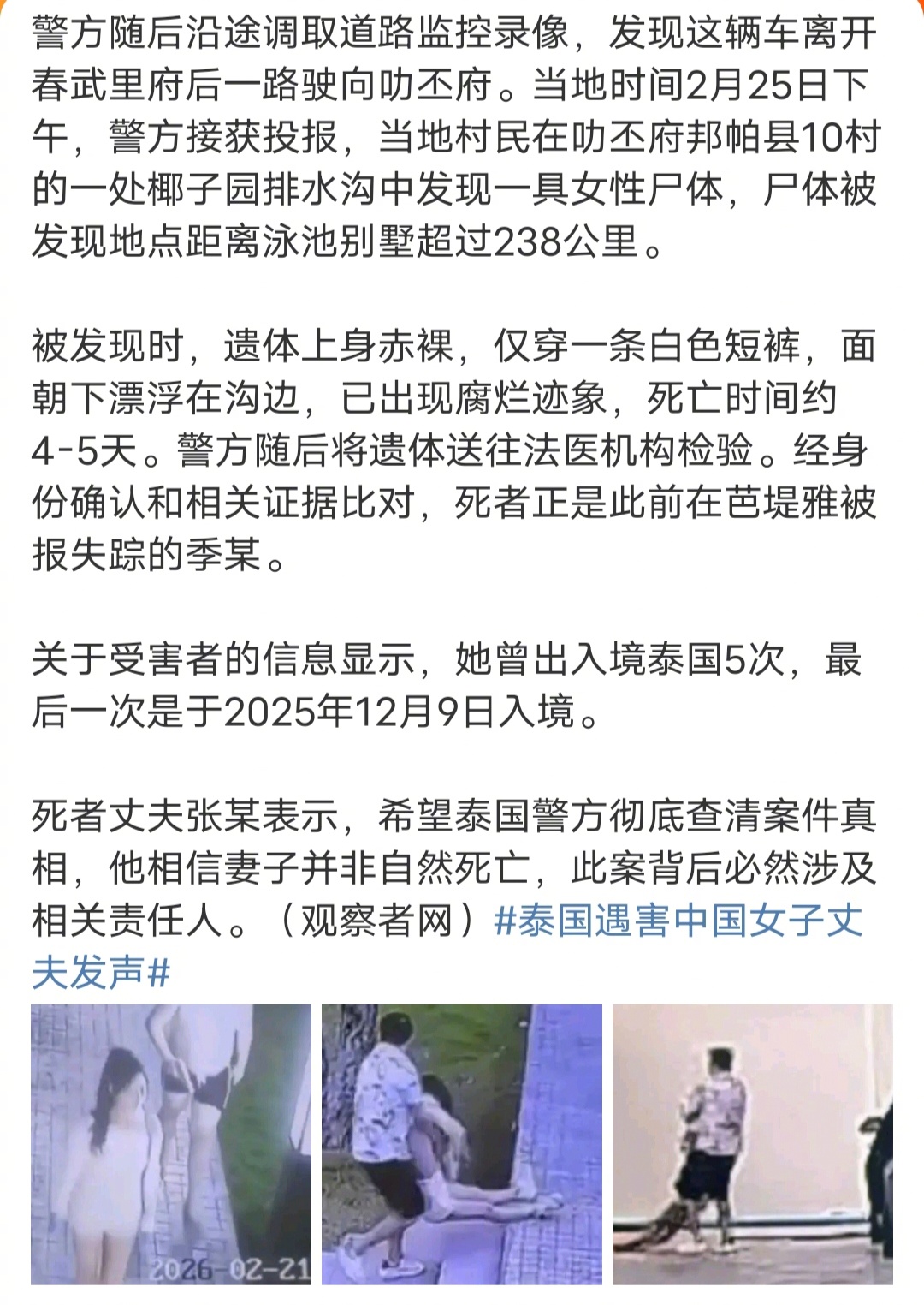 警方随后沿途调取道路监控录像,发现这辆车离开春武里府后一路驶向叻丕府。当地时间2月25日下午,警方接获投报,当地村民在叻丕府邦帕县10村的一处椰子园排水沟中发现一具女性尸体,尸体被发现地点距离泳池别墅超过238公里。