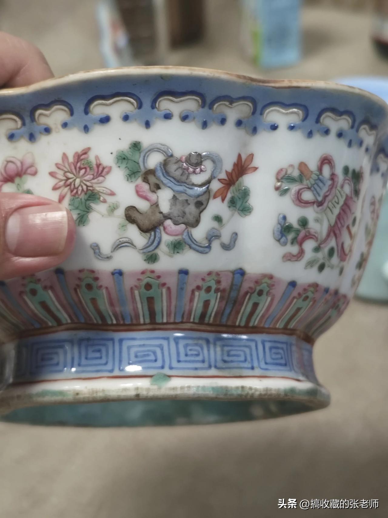这是我一位90多岁老友当年的日用器物,他曾用它装菜、盛汤,偶尔还放水果。懂行的都能看出,这是清代同治年间的粉彩贡碗,纹饰、釉色都带着那个时代的工艺痕迹。 我总觉得,这些古董在当年不过是富有一点人家的“生活垃圾”,只是时光沉淀后,才成了如今稀罕又值钱的老物件。 清代粉彩碗