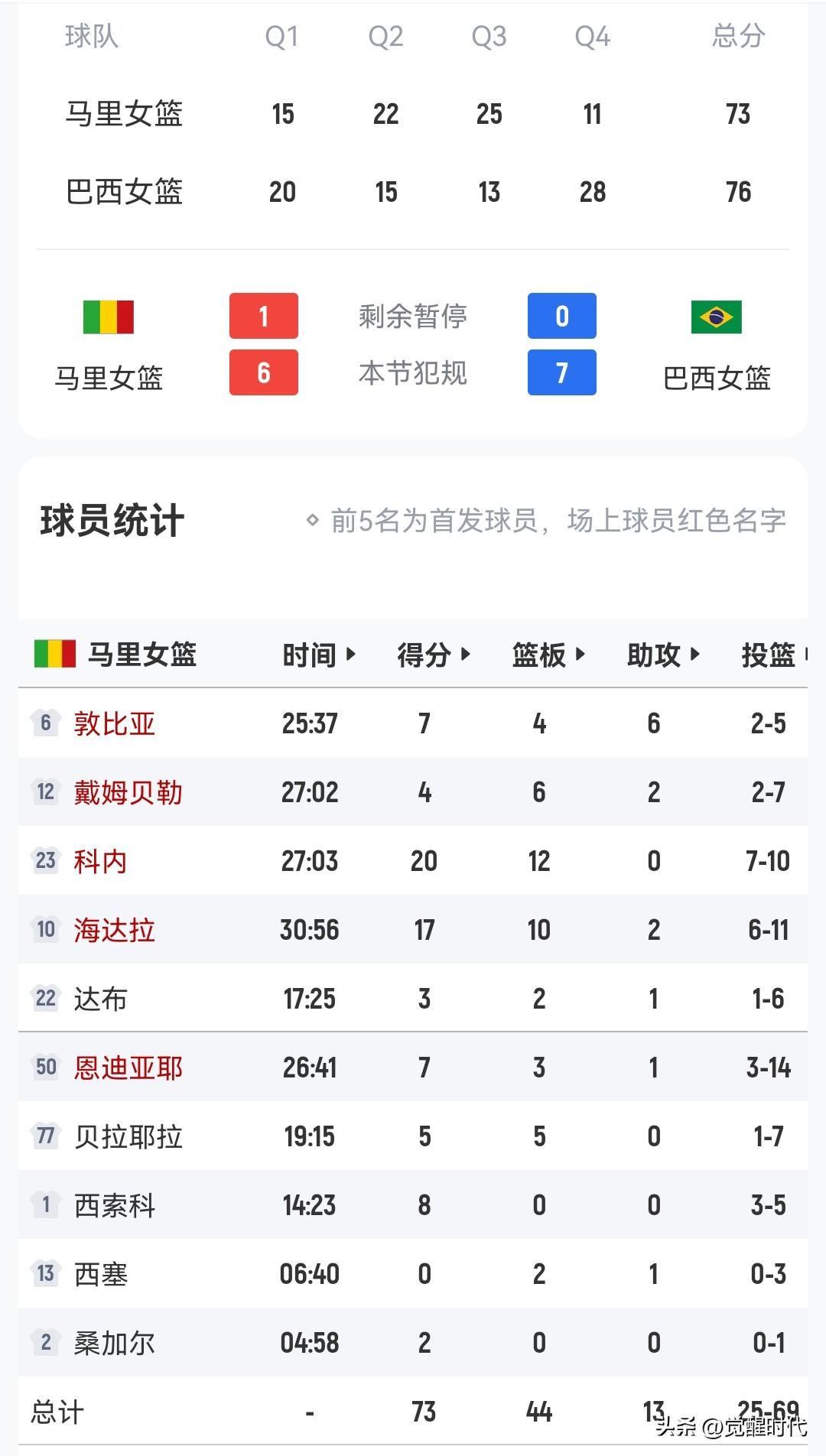巴西女篮3分险胜马里 5人得分上双 不过也是非常艰难取胜