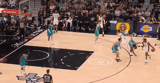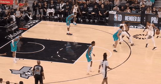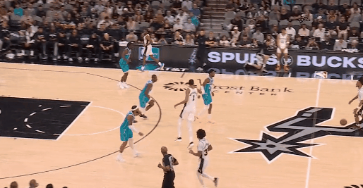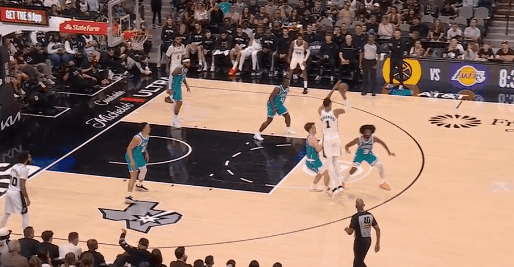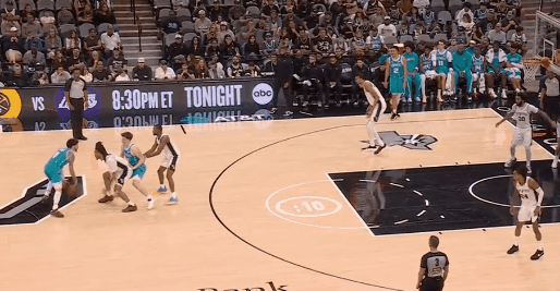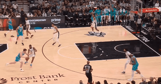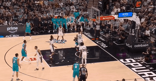 ——福克斯和文班二人转,高抛给文班,文班高抛给后门卡斯尔,两个彩虹高传。黄蜂够不到。