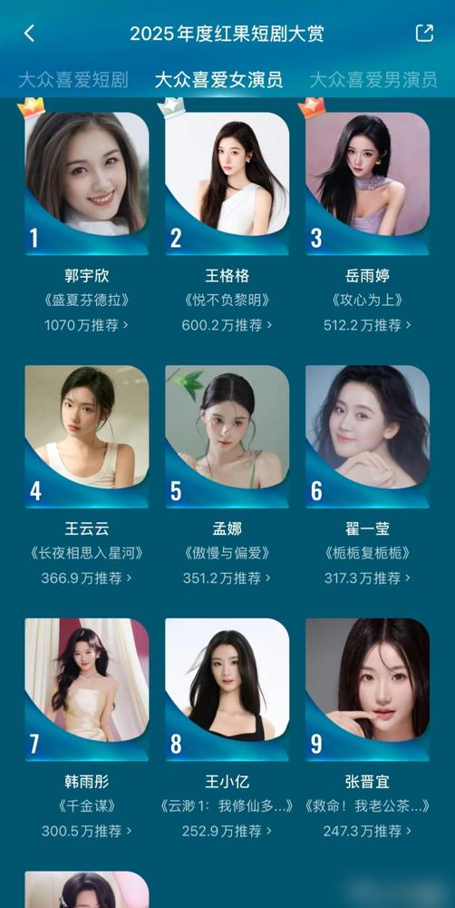 短剧圈这两年的迭代速度,说离谱都算客气。 郭雨欣简直是坐了火箭。之前为交房租入行,拍29部短剧攒经验。去年一部《盛夏芬德拉》爆到全网44亿播放,拿奖拿到手软。红果年度大赏以1070万推荐值断层第一,直接甩开第二名一大截。现在已经转去拍长剧和音乐诗剧,主流认可度蹭蹭涨。 王格格是另一种狠角色。一年拍80多部短剧,全年播放量破260亿,高峰期四五天就换组。从劳模转型品质派,拿了7个大奖,资本就爱这种稳赚的类型。 岳雨婷没公司包装,靠古装硬杀进前三。就是角色有点同质化,最近还陷抄袭风波,热度忽上忽下。 以前的头部演员不少被甩在后面,有的去长剧演配角了。这行哪有什么永恒王座,要么拼产量要么出爆款,跟不上就得靠边站。