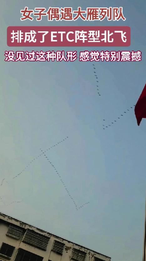 解释不清了,河南,一女子接孩子放学,发现有人指着天空,嘴里在说些什么,女子抬头一看直接傻眼了,只见成群的大雁排成ETC阵型往北飞,女子觉得这画面太震撼了,从来没见过大雁还能这么排队。 初春的河南周口,午后的阳光褪去了寒意,刚好铺在校园门口的小路上,放学的铃声刚落,孩子们背着书包叽叽喳喳地涌出校门,接孩子的大人们步履匆匆,没人会想到,一场能刷屏的自然奇景,正在头顶的天空悄悄酝酿。 原本喧闹的校门口,不知从什么时候开始静了下来,有人停下了脚步,抬起手指着天空,嘴里低声念叨着,眼神里满是诧异。 原本着急找孩子的女子也跟着顿住了脚步,手里还攥着给孩子准备的面包,顺着大家指的方向抬头望去,整个人瞬间定在了原地。 她活了几十年,每年春天也能看到大雁北归,不是规整的人字,就是利落的一字,却从来没见过这样的阵仗。 一大群大雁在天空中舒展翅膀,排列得规整又别致,不偏不倚,刚好形成了酷似ETC通道的形状,朝着北方缓缓飞去,连翅膀扇动的节奏都近乎一致,飞过头顶时,能隐约听到低沉的鸣叫,不刺耳,却带着一种属于自然的力量。 周围的人们也都反应了过来,纷纷拿出手机,快门声此起彼伏,没人喧哗,大家都屏住呼吸,生怕惊扰了这群空中的“小精灵”,连原本吵闹的孩子,也被这一幕吸引,乖乖拉着家长的手,抬头望向天空。 女子站在原地,忘了找孩子,也忘了手里的面包,目光一直追随着大雁的身影,直到它们慢慢缩小,消失在天际尽头,才缓缓回过神来,心里满是震撼。 她后来才知道,大雁这样编队飞行,从来不是为了摆造型,而是刻在骨子里的生存智慧,长途迁徙千里,每一次扇动翅膀都要消耗大量体力,编队飞行能借助同伴翅膀产生的气流,节省三成以上的体力,续航能力也能大幅提升。 就像一支配合默契的团队,还会实行“轮岗制”,头雁飞累了就换到两侧,让体力充沛的同伴接替,稳稳当当朝着目的地前进。 至于这场罕见的ETC阵型,其实是一场大自然的巧合,大雁的编队从来不是一成不变的,会根据当时的风速、气流灵活调整。 那天周口的气流条件特殊,再加上地面视角的视觉错位,原本在三维空间里错落飞行的大雁,落在人们眼里,就成了酷似ETC的模样。 那天的校园门口,没有惊天动地的场面,却因为这群大雁,让原本匆匆忙忙的人们,停下了脚步,感受到了自然的神奇。 女子接走孩子的时候,还在跟孩子念叨刚才看到的一幕,孩子睁着好奇的眼睛,追问着大雁的去向。 其实生活就是这样,平凡的日子里,总有这样猝不及防的美好,一群大雁,一个巧合的阵型,不仅让人们看到了生灵的智慧,也让大家在忙碌的生活中,收获了一份久违的震撼与温暖。