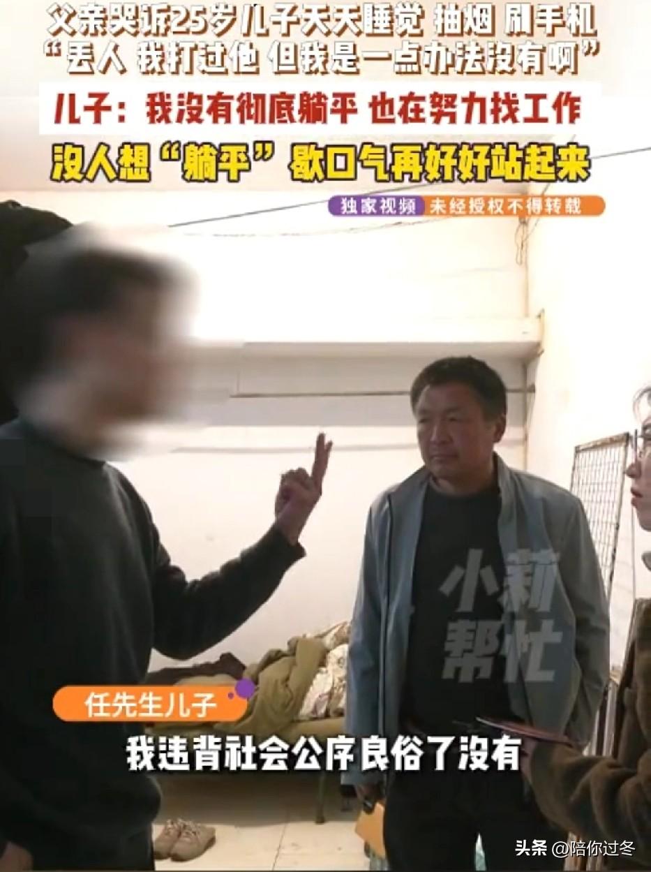25岁儿子毕业后不工作急哭父亲! 儿子抽烟,睡觉,打游戏,父亲恨铁不成钢,急得团团转,父子两人吵的不可开交,父亲还动手打了儿子,这么大个人了,不工作确实不合适,父亲应该慢慢开导! 3月14日,据媒体报道,河南新乡的任先生遇到了难题,找到了记者希望得到帮助。 据任先生透露,自己的儿子今年25岁了,毕业了一个月了,天天在家睡觉、抽烟、打游戏,无所事事,也不出门找工作,整个人非常懒惰,没有上进心。 任先生是看在眼里急在心里,面对儿子的“啃老”行为,非常生气,父子二人为了此事已经吵了很久了。 今天记者受邀来到任先生家中进行调解,调解现场任先生直接被儿子气哭,委屈的说道:“实在没有办法才打电话给你们,儿子不上班,太丢人了,以后怎么养活自己呢?” 面对父亲的指责,儿子辩解道:“我没有违法,也没有违背社会公序良俗,更没有麻烦别人,我有错吗?”儿子还透露,自己已经面试了几份工作,暂时还没有结果,父亲催的太厉害。 其实本来事情也不大,父亲希望儿子有上进心,有出息,有个好工作,而儿子刚毕业,可能需要时间来适应社会。 最终在记者的调解下,父子二人隔阂消除父亲同意给时间让儿子找工作适应社会,儿子也同意不再“躺平”,会努力找工作!儿子打工经历