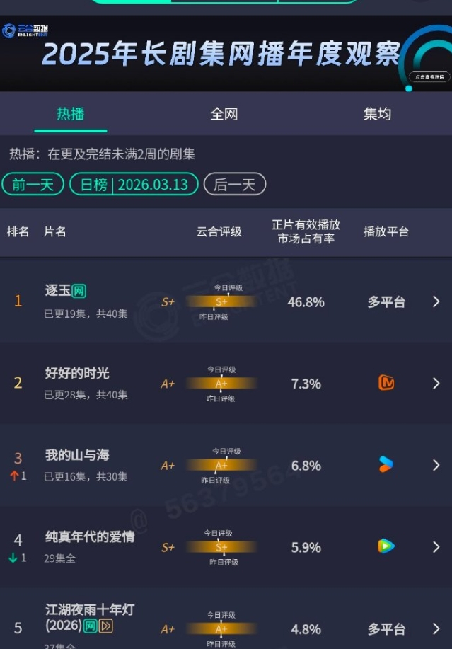 《逐玉》云合占比46.8%目前已经超了《生万物》,暂列历史第三,仅次于《狂飙的》67.9%,和《庆余年2》的55%,其实这个云合占比高主要还是时机问题,云合超过40%的起7部剧是《狂飙》,《庆余年2》,《逐玉》,《生万物》,《赘婿》,《许我耀眼》,《生万物》,但不代表这几部就一定是历年最爆的剧,只是同档期能打的剧不多,所以被这几部剧吸干了大盘,当年《苍兰诀》,《星汉灿烂》,《沉香如屑》三部剧对打,云合占比就都到不了40%,还有《卿卿日常》,《风吹半夏》和《爱的二八定律》三部剧对打数据也会偏低。