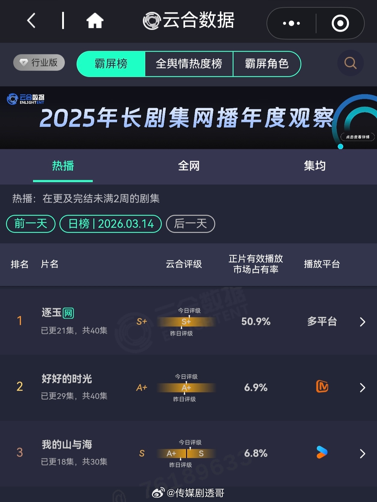 张凌赫、田曦薇《逐玉》云合市占率破50.9%,是今年第一部市占率破50%和单日有效播放破亿剧集 逐玉云合破50%