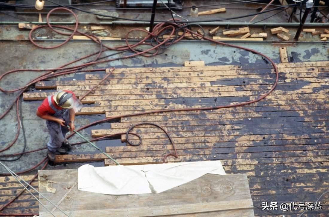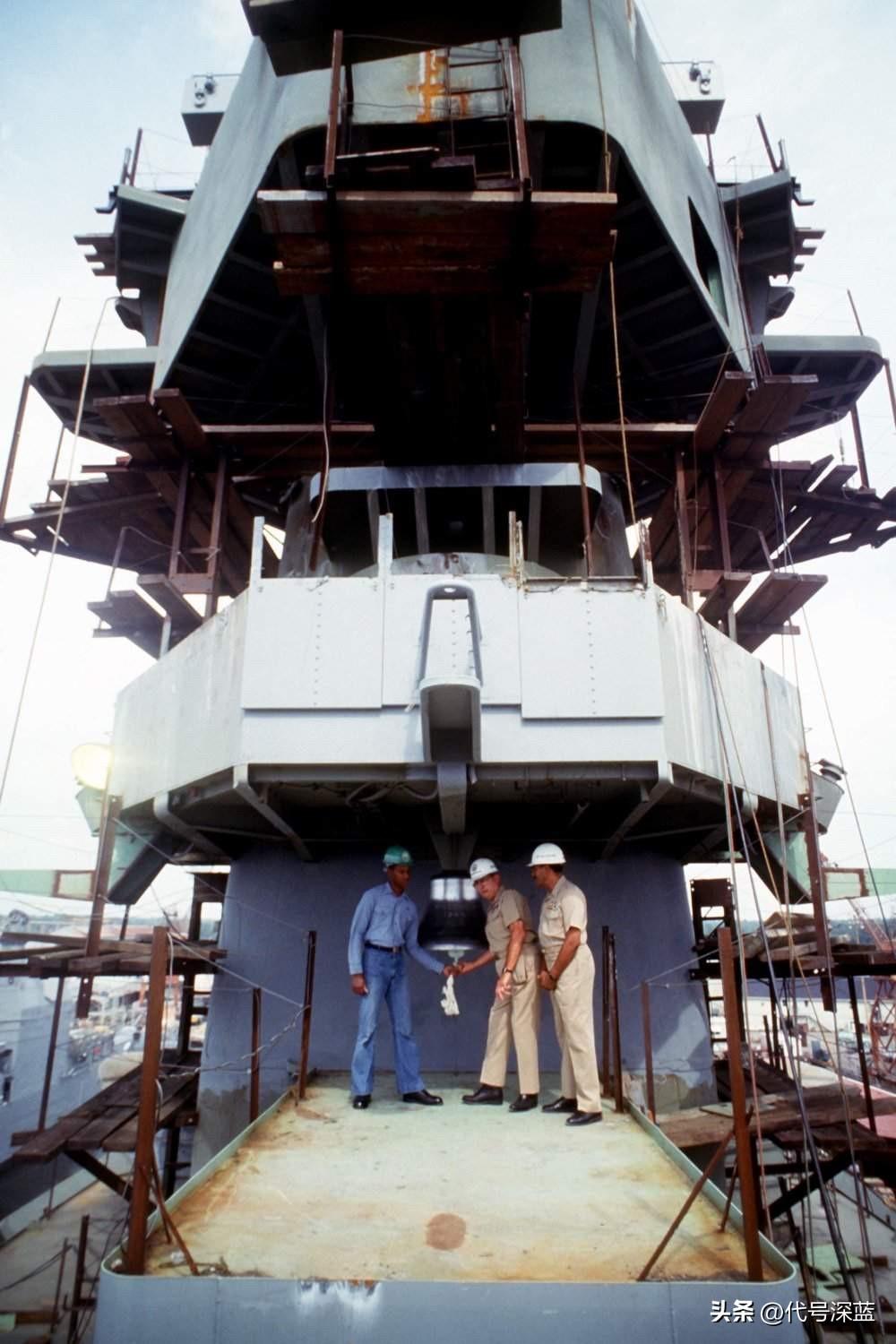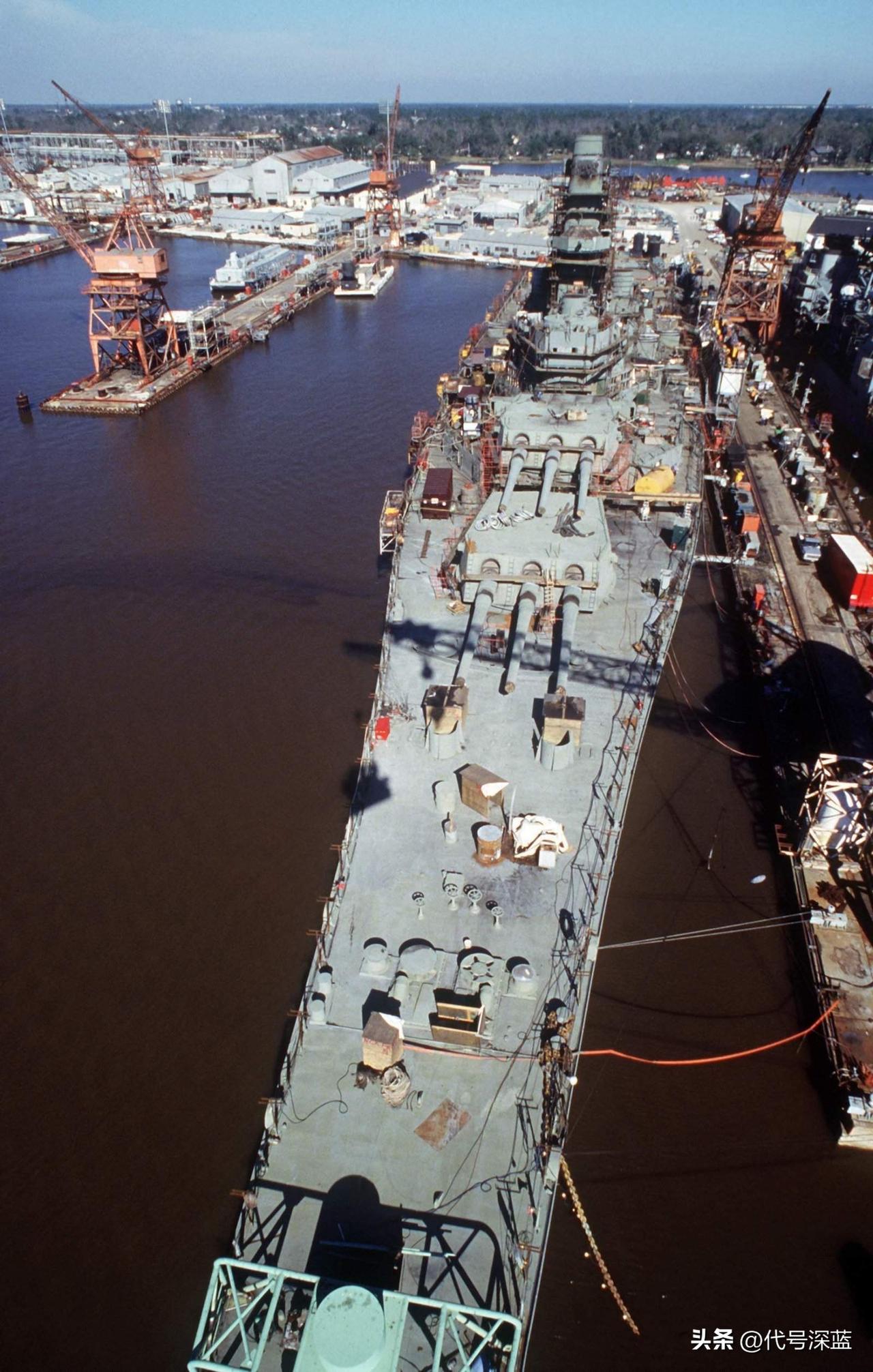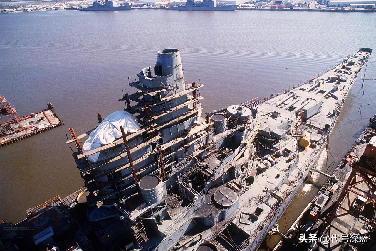 1987年正进行现代化改装的威斯康星号战列舰。 1987年9月17日,脚手架环绕着威斯康星号(BB-64)的上层建筑。这艘战列舰正在英格尔斯造船厂为重新服役进行大修和现代化改装,此时已完成50%。美国海军战列舰 战列舰 战舰世界