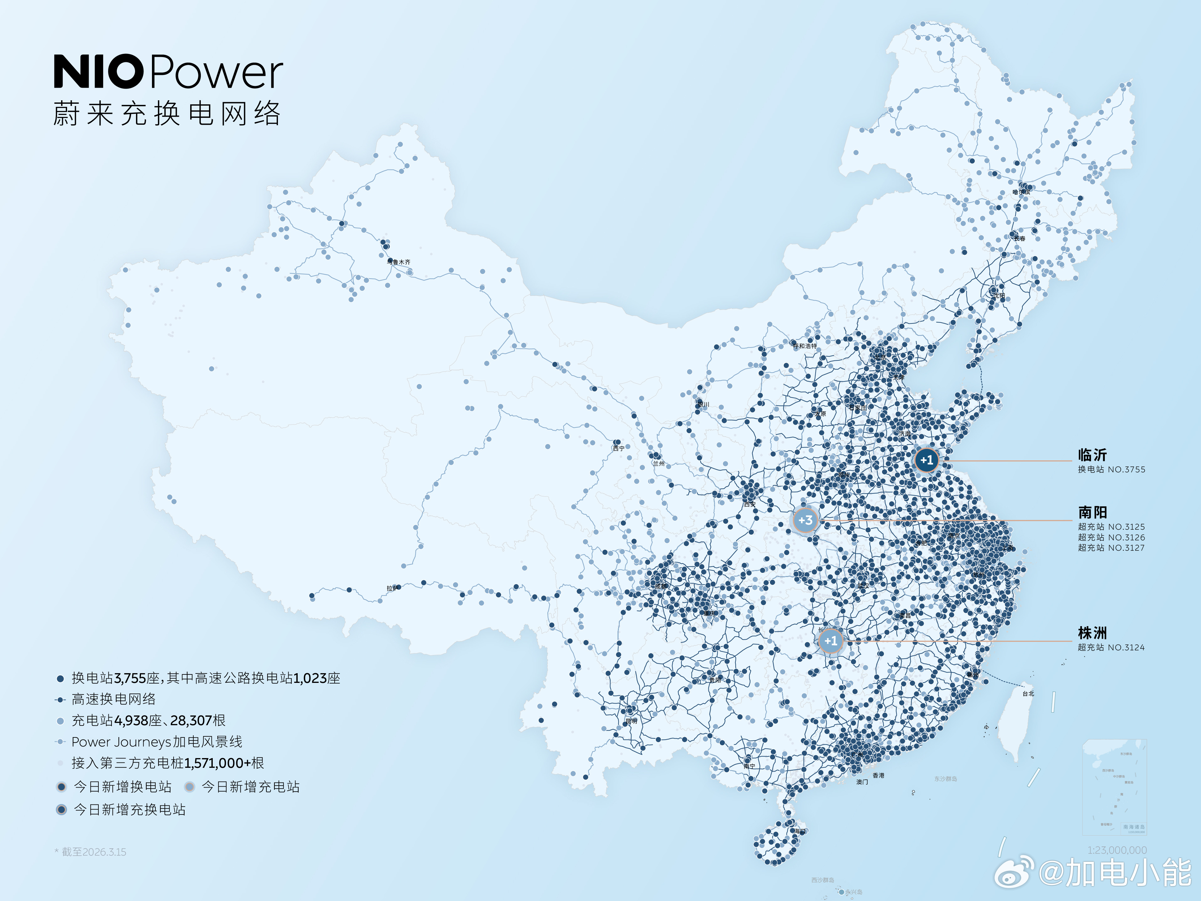 3月15日NIO Power 5站上线NO.3755 蔚来换电站 | 临沂郯城皇亭路NO.3124 蔚来超充站 | 株洲红星美凯龙NO.3125 蔚来超充站 | 南阳新野臻品mall购物中心NO.3126 蔚来超充站 | 南阳西峡迎宾大道NO.3127 蔚来超充站 | 南阳方城游泳健身馆持续布局-让加电比加油更方便