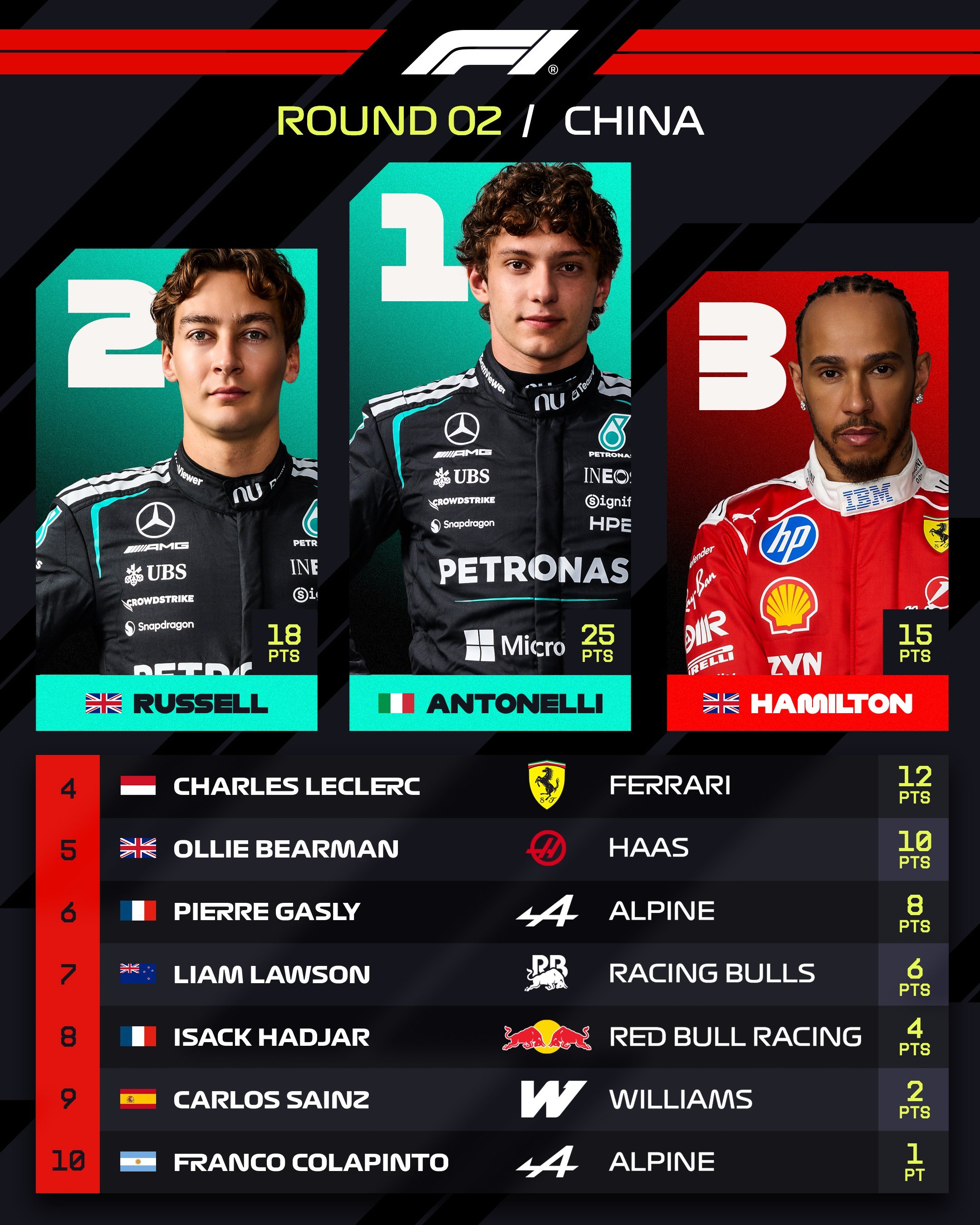 梅奔的赛车还是太强了,连续两周实现Pole To Win+一二带回,只不过这一次的冠军不是拉塞尔,而是19岁的安东内利