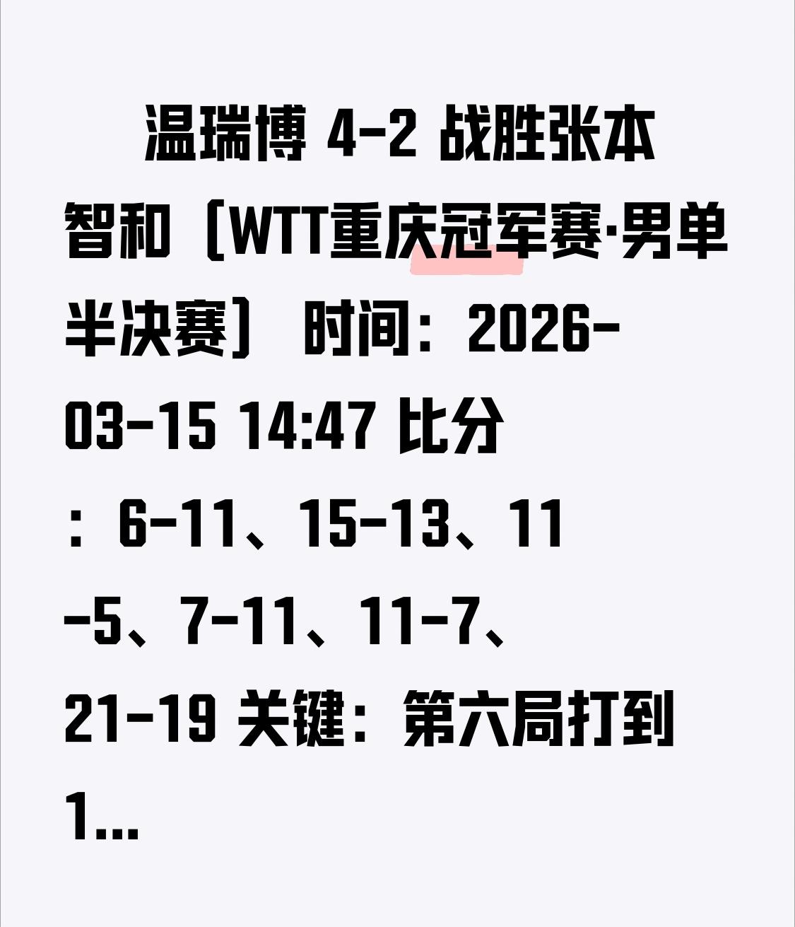 🏓 温瑞博 4-2 战胜张本智和(WTT重庆冠军赛·男单半决赛) 时间:2026-03-15 14:47 比分:6-11、15-13、11-5、7-11、11-7、21-19 关键:第六局打到19-19,温瑞博连拿2分,21-19险胜,大比分4-2晋级决赛。 🏆 决赛对阵 温瑞博 vs 法国选手菲利克斯·勒布伦(今晚19:30)