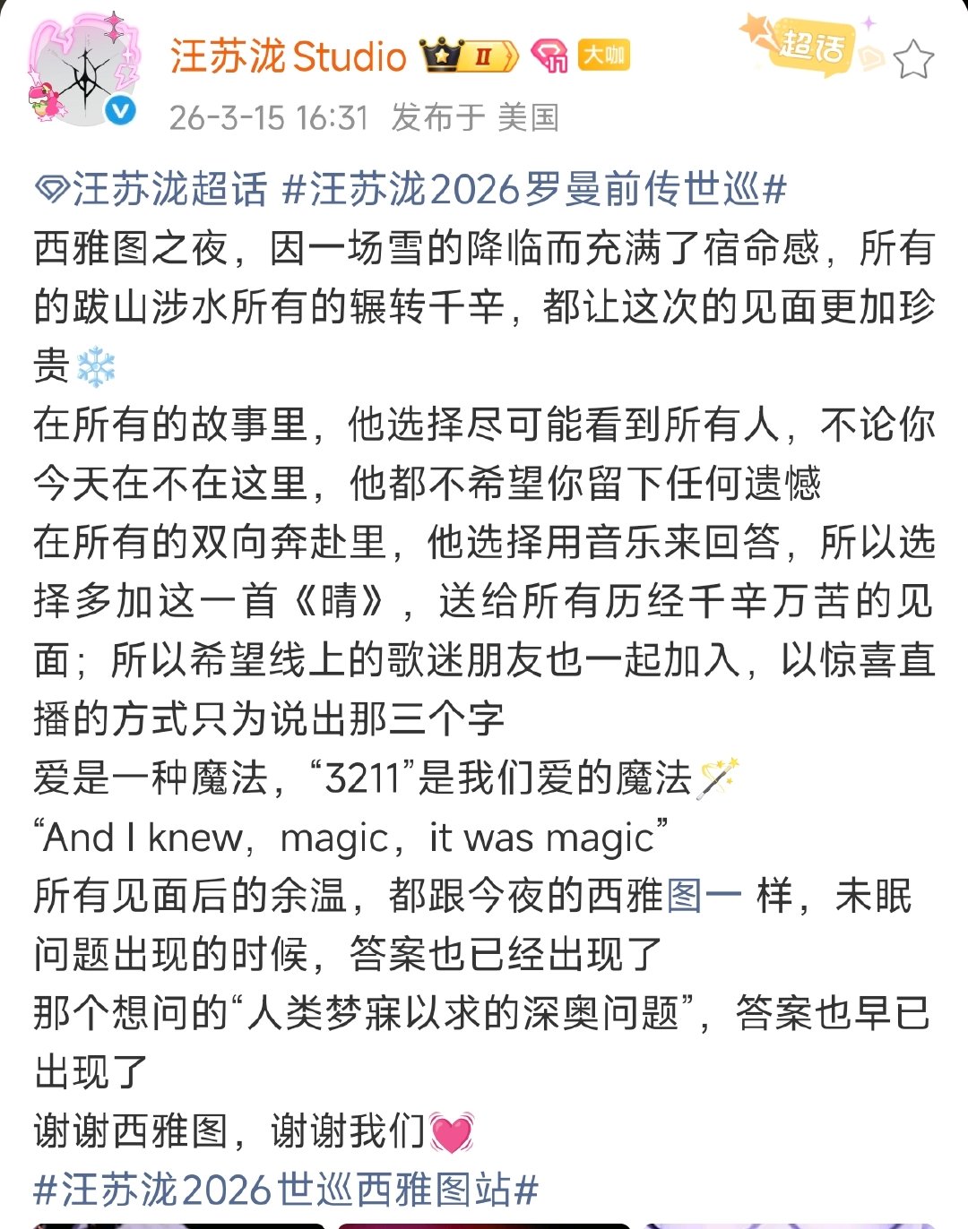汪苏泷选择用音乐来回答汪苏泷西雅图站多加这一首晴西雅图的雪落进旋律里,双向奔赴的心意有了最动听的答案。汪苏泷用《晴》回应所有跋涉,让跨越山海的相见,都被爱与魔法温柔包裹。