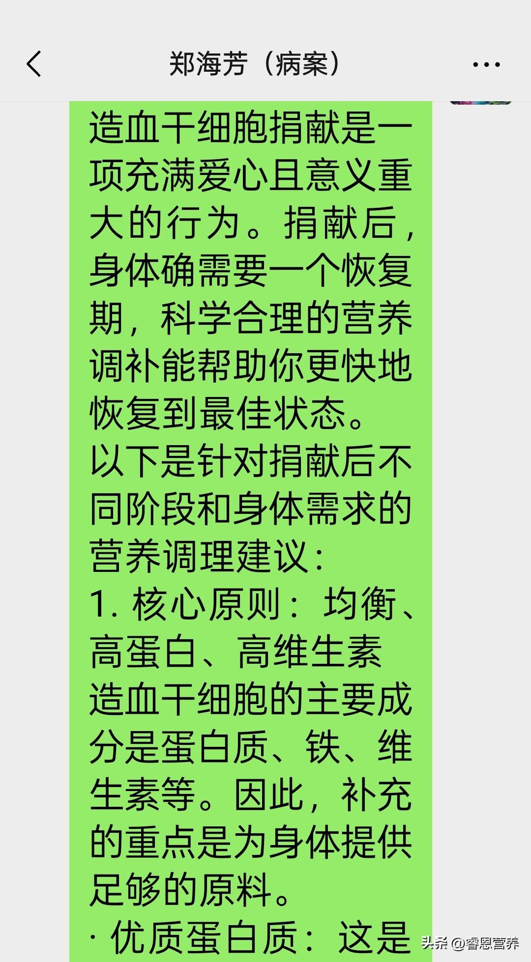 造血干细胞捐献是一项充满爱心且意义重大的行为。黄石市营养学会郑海芳理事捐献后,学会及时送上身体营养调补建议: 1. 核心原则:均衡、高蛋白、高维生素 造血干细胞的主要成分是蛋白质、铁、维生素等。因此,补充的重点是为身体提供足够的原料。 · 优质蛋白质:这是修复身体和制造血细胞的基础。· 来源:鱼肉(特别是深海鱼)、虾、瘦猪肉、牛肉、鸡肉、鸡蛋、牛奶、豆制品(如豆腐、豆浆)。· 建议:每天保证摄入至少一个鸡蛋、一杯牛奶和150-200克的肉类或豆制品。· 补铁食物:捐献后血容量和血红蛋白的恢复需要铁。· 动物性铁(吸收率高):红肉(牛肉、瘦猪肉)、动物肝脏(如猪肝,建议每周1-2次,每次50克左右)、动物血(鸭血、猪血)。· 植物性铁:菠菜、黑木耳、红枣、芝麻。搭配富含维生素C的食物(如青椒、番茄、橙子)一起吃,可以提高铁的吸收率。· 补充维生素:· 维生素B族和叶酸:对细胞分裂和成熟至关重要。存在于深绿色蔬菜(菠菜、西兰花)、豆类、坚果中。· 维生素C:促进铁吸收,增强免疫力。多吃新鲜水果(猕猴桃、鲜枣、柑橘类)和蔬菜。 2. 针对性营养补充(恢复期1-3个月) · 多喝水:捐献后身体可能会有些脱水,多喝水有助于新陈代谢和体力恢复。每天建议饮水1500-2000毫升(包括汤、粥等)。· 传统滋补(根据体质选择):· 气血双补:中医认为捐献后气血略有损耗。可以用黄芪、当归、枸杞炖汤,或者煮红枣桂圆粥,有助于补气养血。· 健脾养胃:良好的消化吸收是营养补给的前提。多吃易消化的食物,如山药粥、小米粥,避免油腻、辛辣刺激肠胃。· 经典食疗方:党参红枣炖鸡汤、黑豆桂圆汤、猪肝菠菜汤。 3. 需要避免的误区 不要暴饮暴食:身体处于恢复期,消化系统功能可能较弱,大补特补反而会增加身体负担。应该循序渐进,少食多餐。 避免大补中药:在没有医生指导的情况下,不要随意服用人参、鹿茸等大补药材,以免引起身体不适或虚不受补。 戒烟限酒:吸烟和饮酒会影响造血功能和身体恢复,恢复期间应尽量避免。 4.生活调理 · 保证充足睡眠:睡眠是最好的修复方式,尽量保证每天7-8小时的睡眠。· 适度活动:休息为主,但可以进行散步等轻度活动,有助于血液循环和体力恢复。避免剧烈运动和重体力劳动至少2-4周。· 保持良好心态:情绪对身体恢复也很重要。干细胞移植治疗