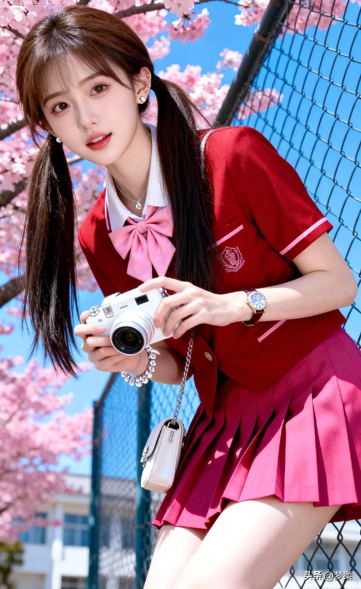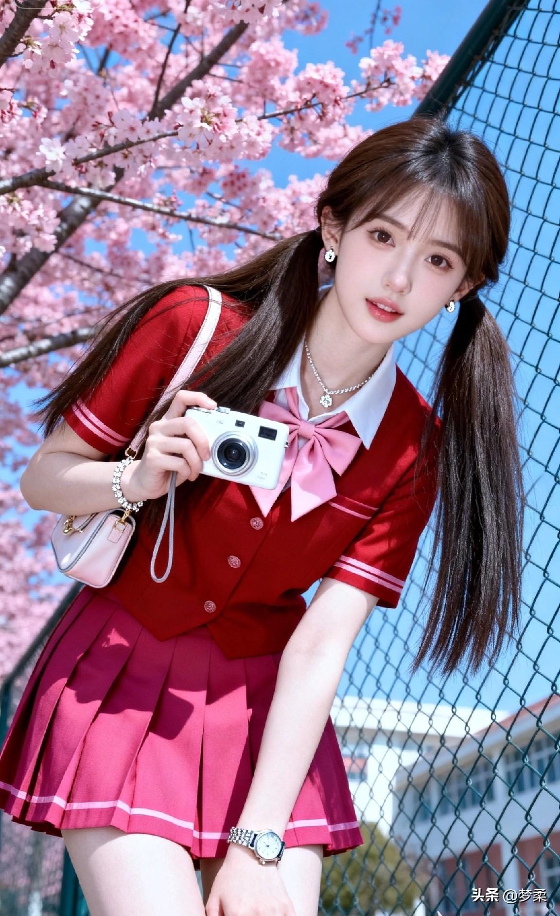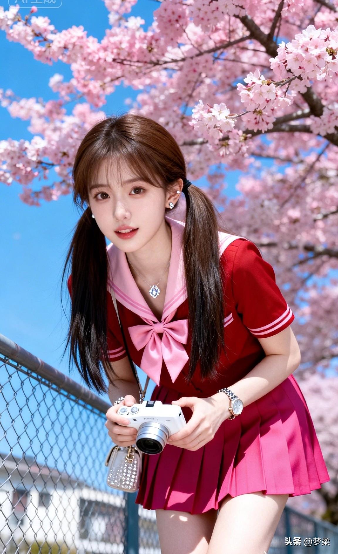 樱花树下,青春洋溢的少女,手持相机,记录美好瞬间!
