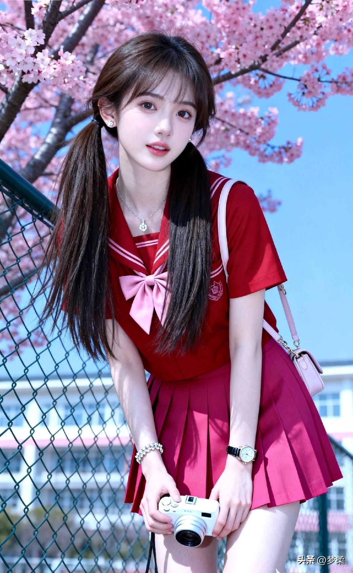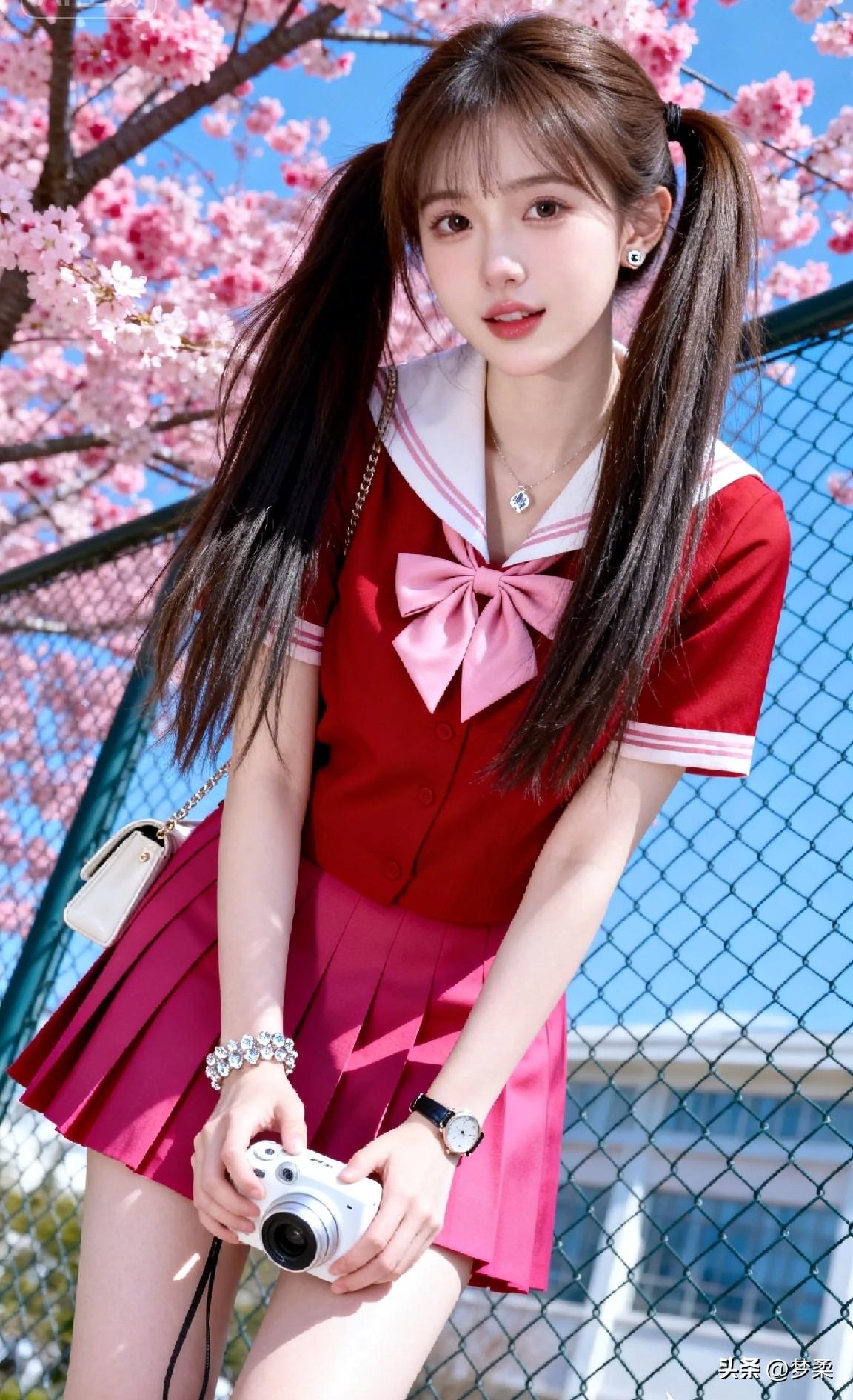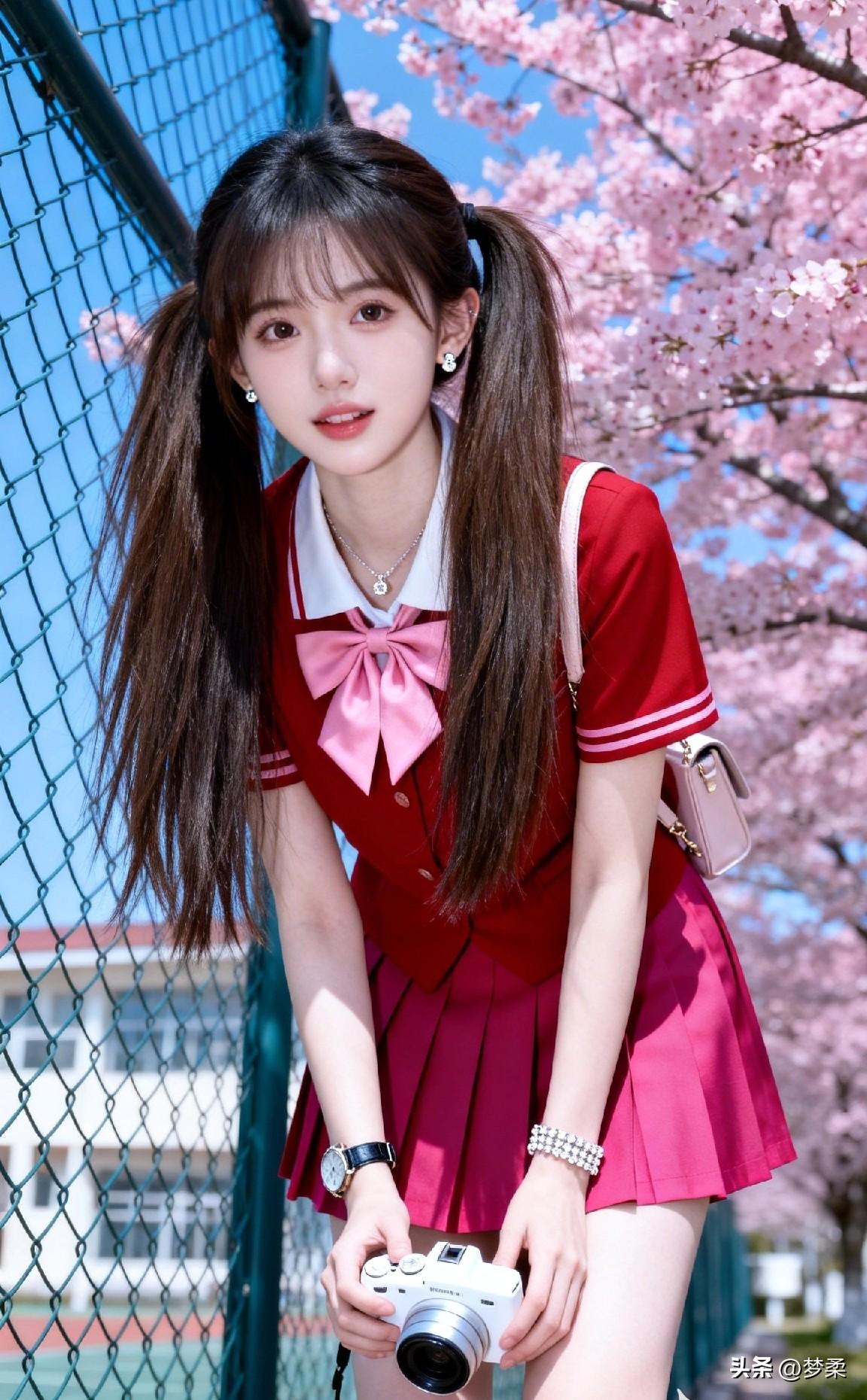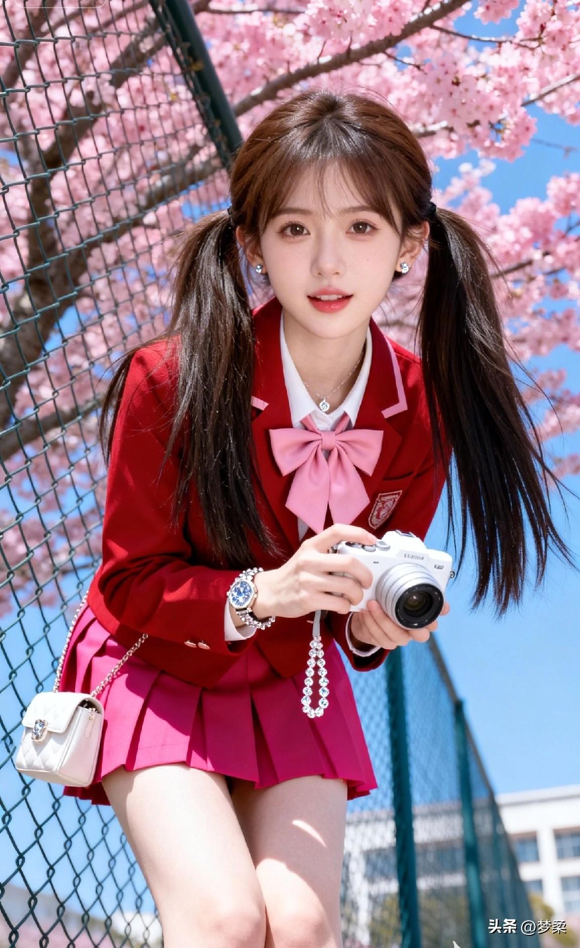 樱花树下,青春洋溢的少女,手持相机,记录美好瞬间!