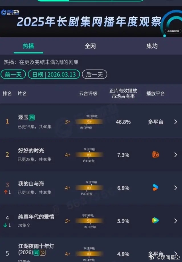 《逐玉》云合占比46.8%目前已经超了《生万物》,暂列历史第三,仅次于《狂飙的》67.9%,和《庆余年2》的55%,其实这个云合占比高主要还是时机问题,云合超过40%的起7部剧是《狂飙》,《庆余年2》,《逐玉》,《生万物》,《赘婿》,《许我耀眼》,《生万物》,但不代表这几部就一定是历年最爆的剧,只是同档期能打的剧不多,所以被这几部剧吸干了大盘,当年《苍兰诀》,《星汉灿烂》,《沉香如屑》三部剧对打,云合占比就都到不了40%,还有《卿卿日常》,《风吹半夏》和《爱的二八定律》三部剧对打数据也会偏低。