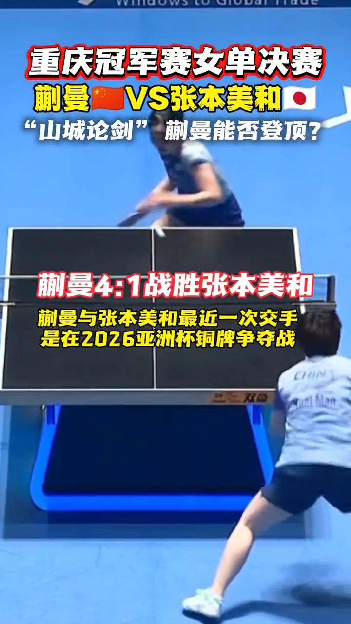 重庆冠军赛女单决赛,蒯曼VS张本美和,"山城论剑"蒯曼能否登顶? 赛事预告:女单决赛中日焦点之争,3.1518:30重庆,蒯曼VS张本美和,虎视眈眈1000积分,张本美和重庆站闯进女单决赛,蒯曼4:1战胜张本美和。蒯曼与张本美和最近一次交手是在2026亚洲杯铜牌争夺战。 今晚女单决赛,一起为中国队加油!蒯曼加油!