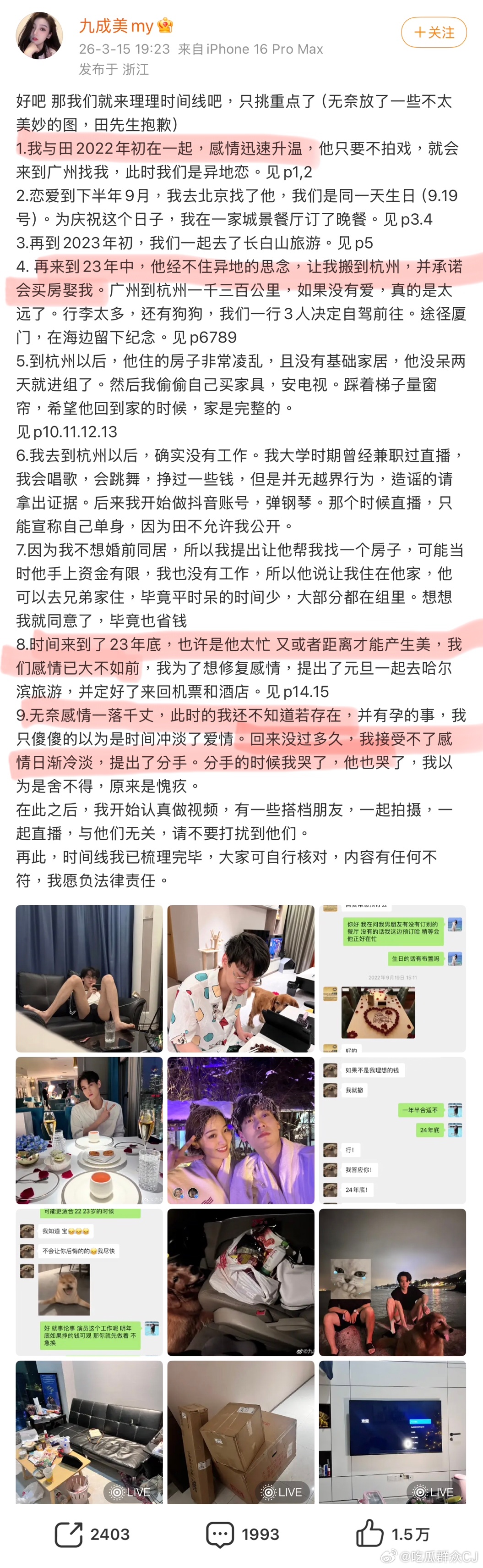 分手后九成美开始认真运营账号,合作友人与前一段无关,希望他们不会因此被打扰。