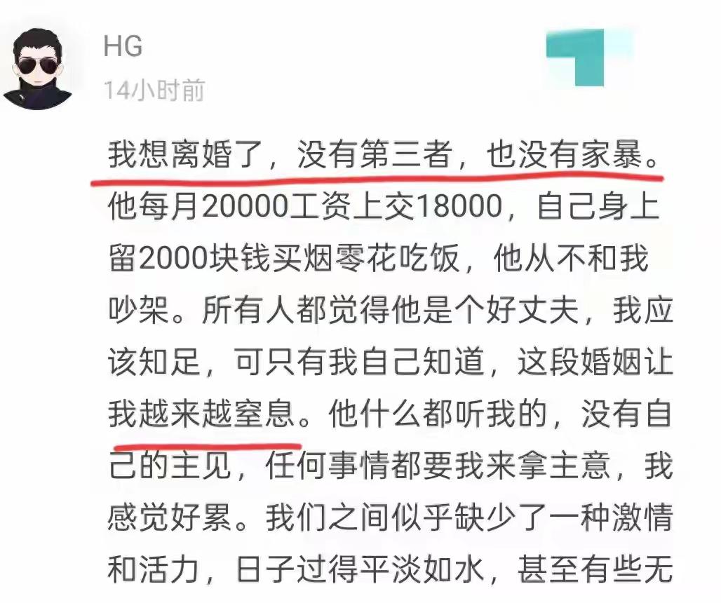 丈夫月薪2万上交1.8万,无家暴无出轨,她却要离婚?💔 刷到一位妻子的离婚帖,大家决想不到,男人不吵架、不撩骚、无家暴,在外人眼里是“教科书级好老公”,连亲戚都劝她“别作,要知足”。可她却说:“这段婚姻让我窒息,我想离婚了。” 很多人骂她身在福中不知福,可只有她懂,那个永远说“听你的”“都行”的丈夫,才是最冰冷的杀手。他上交的不是工资,是婚姻免责费——买他不用分担决策,不用共情情绪,不用参与家庭的琐碎与崩溃。 孩子发烧、水管爆裂、兴趣班选择,所有事都压在她一人身上。他把钱交了,就把责任、陪伴、共情全交了出去。这种“无过错婚姻”,才是最残忍的精神凌迟:没有争吵,却比争吵更绝望;没有背叛,却比背叛更寒心。 大家觉得是女的作呢?还是女得太强势了呢?还是男的没有真正撑起这个家? 当代婚姻 窒息式婚姻 情感真相