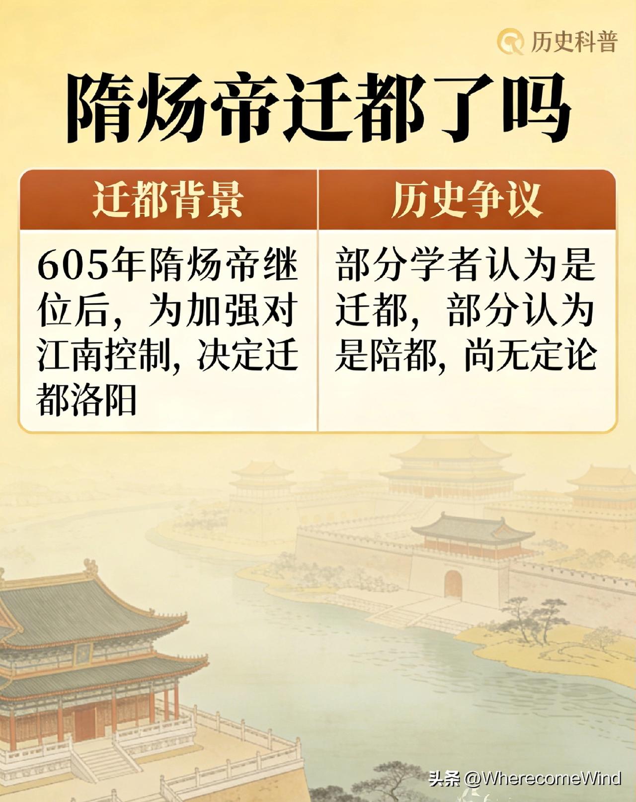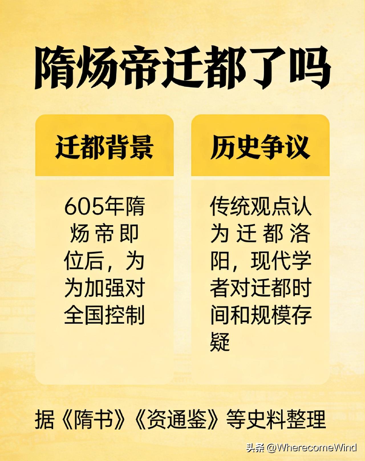 隋炀帝迁都洛阳之谬论 长期以来,不少通史、教材与通俗读物均持“隋炀帝迁都洛阳”之说,其依据多为炀帝营建东京、长期驻跸洛阳理政、改东京为东都等现象,甚至将《营东京诏》等同于迁都诏书,以洛阳设置官署、宫殿作为“已迁都”的证据。本文以《隋书》《资治通鉴》《通典》等原始文献为依据,从迁都法定要件、都城名号等级、太庙社稷礼制、京师法统传承四个层面进行考证,明确指出: 隋炀帝终其一生,并未在法理与礼制上实行迁都洛阳之举。 洛阳自始至终为陪都,初称东京,后升东都,均不具备京师地位;长安则始终为隋代唯一法定京师。所谓“迁都洛阳”,是将事实行政中心混同于法理首都的误判,不符合中古都城制度与历史真相。 一、引言 大业元年(605),隋炀帝下诏营建洛阳,以为关东、江南枢纽;大业五年(609),改东京为东都,此后炀帝多在洛阳处理政务。正因这种长期驻跸的现象,“迁都洛阳”成为流传极广的观点。 但在中国古代政治礼制中,迁都不是“皇帝搬过去办公”,而是法统与礼制的根本变革。 判断是否迁都,有不可动摇的硬标准: 1. 有正式迁都诏书 2. 明确以新都为“京师” 3. 迁太庙、社稷至新都 4. 旧都京师地位被废除或取代 四项缺一不可。 以此对照隋炀帝一朝,一条都不满足。 二、前提:何谓真正的“迁都” 中古王朝,凡迁都必具备: 1. 皇帝下诏,明言迁都、移都、改某为京师; 2. 迁都必迁庙、迁社,祖庙与社稷是国家根本; 3. 新都名号必为京师、京城,而非“某京、某都”; 4. 旧都法统被取代。 隋炀帝营建洛阳,完全不满足上述任何一条。 三、第一证:无迁都诏书,《营东京诏》绝非迁都文 《隋书·炀帝纪》大业元年三月: 丁未,诏尚书令杨素、纳言杨达、将作大匠宇文恺营建东京。 炀帝只下过一道**《营东京诏》**,内容非常清晰: - 营建城池 - 设立官署 - 便于控御东方 全文无“迁都”“移都”“以洛阳为京师”“罢长安京师”之语。 历史上真正的迁都,如北魏孝文帝迁都洛阳、明成祖迁都北京,均有专门、公开、正式的迁都诏,向天下宣告法统转移。 隋炀帝若真迁都,绝不可能不发诏书、不明定名分。 结论一: 无迁都诏书,即无法理迁都。 将《营东京诏》说成“迁都诏”,是无稽之谈。 四、第二证:东京、东都皆陪都,京师只有长安 隋代都城名号等级森严: 1. 京师 唯一、法定、正统首都。 终隋一代,京师专指长安(大兴城)。 2. 东京(605–609) 方位性陪都,仅表地理位置。 3. 东都(609–隋亡) 由东京升级而来,地位提高,但仍是陪都。 关键区别: - 京、京师 = 正都 - 都 = 陪都、行都 东京 → 东都,只是陪都内部升级, 从来不是“升为京师”。 《隋书》《资治通鉴》中,凡涉及国家大典、宗庙祭祀、法统正朔,一律称长安为京师,洛阳从无“京师”头衔。 结论二: 洛阳只是陪都升级,从未成为京师。 东都再尊,不是正都。 五、第三证:洛阳无太庙、无社稷,无迁都礼制根基 太庙、太社、太稷,是京师的身份证。 只有京师能立国家太庙与社稷。 《隋书·礼仪志》《通典·礼》明确记载: 隋代太庙、社稷自隋文帝定都大兴(长安)后,即固定于长安。 - 隋炀帝没有迁庙 - 没有迁社 - 没有在洛阳另立太庙社稷 洛阳只有宫殿、官署,是办公中心, 不是国家礼制中心。 结论三: 无太庙、无社稷,洛阳连“京师资格”都不具备。 六、第四证:长安京师地位始终未废 最关键的一条: 整个隋朝,没有任何一道文件废除长安的京师地位。 历代正史、政书、地理志均一致: - 长安:京师 - 洛阳:东京、东都 炀帝常住洛阳,只是行在、行政中心转移, 不是法统首都转移。 结论四: 事实中心 ≠ 法理首都。 行政搬家 ≠ 迁都。 七、总结论 1. 隋炀帝从未颁布迁都诏书,《营东京诏》只是营建诏书,不是迁都依据。 2. 洛阳先后称东京、东都,均为陪都,从未成为“京师”。 3. 洛阳无太庙、无社稷,不具备京师礼制资格。 4. 长安始终是法定京师,法统从未转移。 一句话,隋炀帝只建了陪都,从来没有迁都。