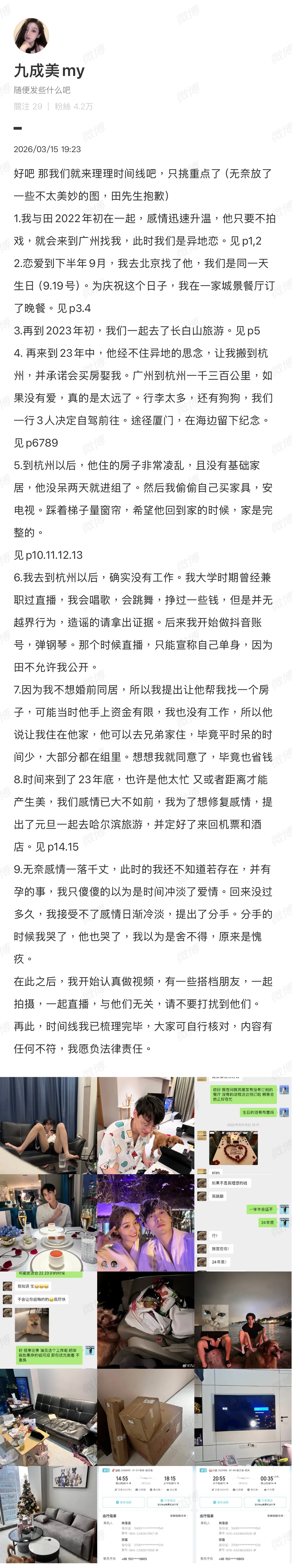 九成美梳理了和田栩宁在一起的时间线,其中第九点提到了恋爱期间若若的存在并且当时若若已怀有身孕的情况,并称内容有任何不符,愿意承担法律责任,好完整的时间线啊,以后内娱锤人都按这个标准来!田栩宁九成美时间线