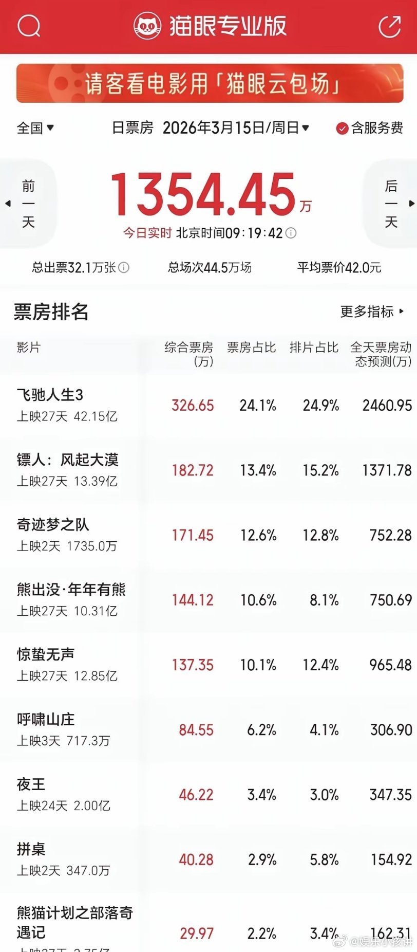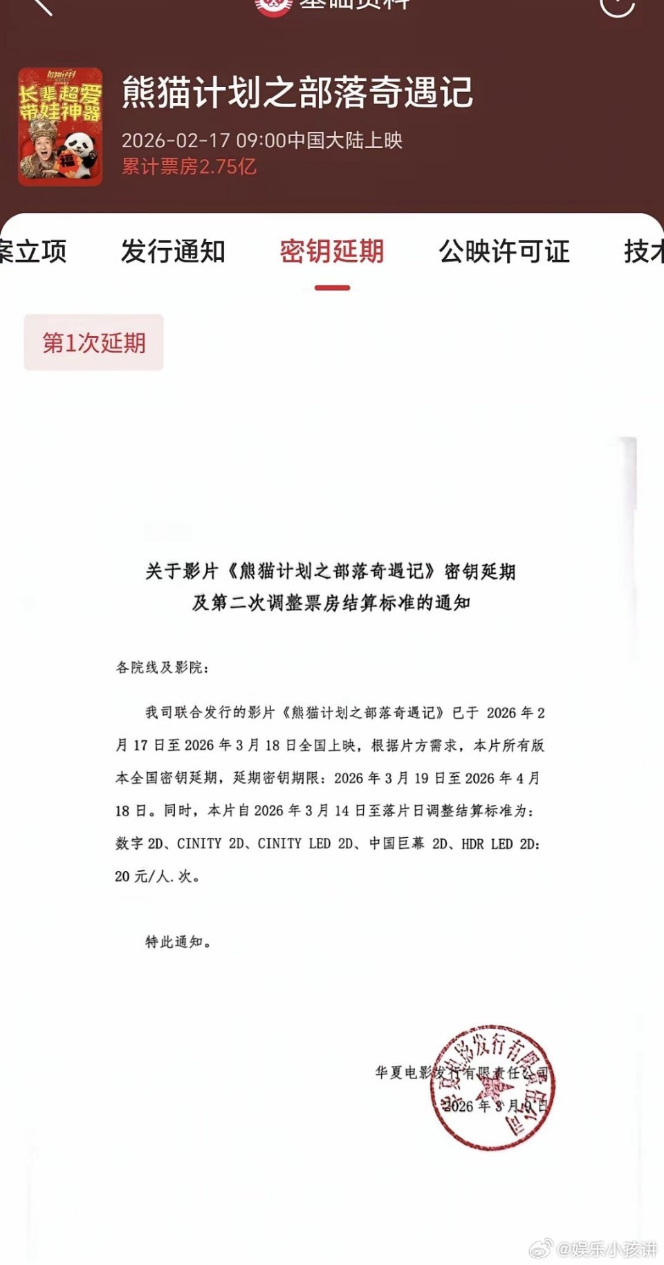 同样春节档延期,《镖人》只到16号,其它电影都是到18号,差这两天的门道在哪?仔细扒了扒几部春节档电影的密匙延期通知,发现一个有意思的现象:《飞驰人生3》42亿+,延期到4月18日——票房顶流,多占个周末,没毛病。但往下看就迷惑了:《惊蛰无声》12.85亿,延期到4月18日《熊出没》 10.31亿,延期到4月18日《熊猫计划》 2.75亿, 延期到4月18日而《镖人》13.39亿,只延到4月16日??等等,13亿的片子,延期时长还不如2.7亿的?这是什么逻辑?延期到4月18号(周六),意味着能多占4月17日-18日那个周末的排片空间。别看就两天,对影院来说,周末的场次就是真金白银。按理说,密钥延期是市场给的“加时赛”,票房越高说明观众越买账,越该多留几天收割余热。结果现在倒挂,让人不解!有人说可能是片方策略不同,有人说是为了给新片让路。但问题来了:票房低的能占住周末黄金场,票房高的反而要让道,这是神马情况?难道是:1.《镖人》自己不想多延?2.影院不愿给排片?3.这里面有我们不知道的发行潜规则?欢迎评论区聊聊你的看法哈。