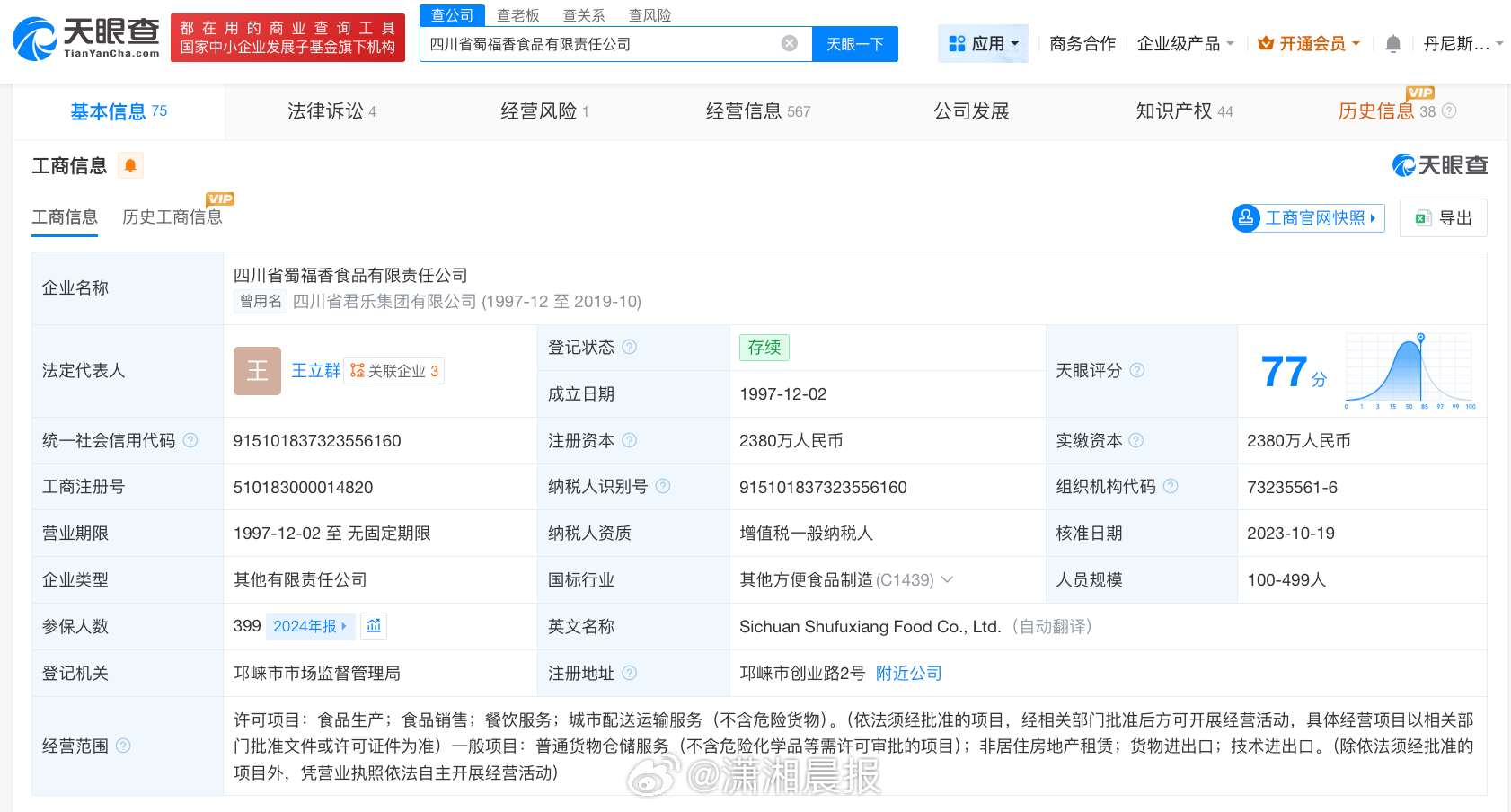 天眼查App显示,四川省蜀福香食品有限责任公司成立于1997年12月,法定代表人为王立群,注册资本2380万人民币,经营范围包括食品生产、食品销售、餐饮服务等,由成都市众兴食品有限公司、四川省荣盛泰集团有限责任公司共同持股。