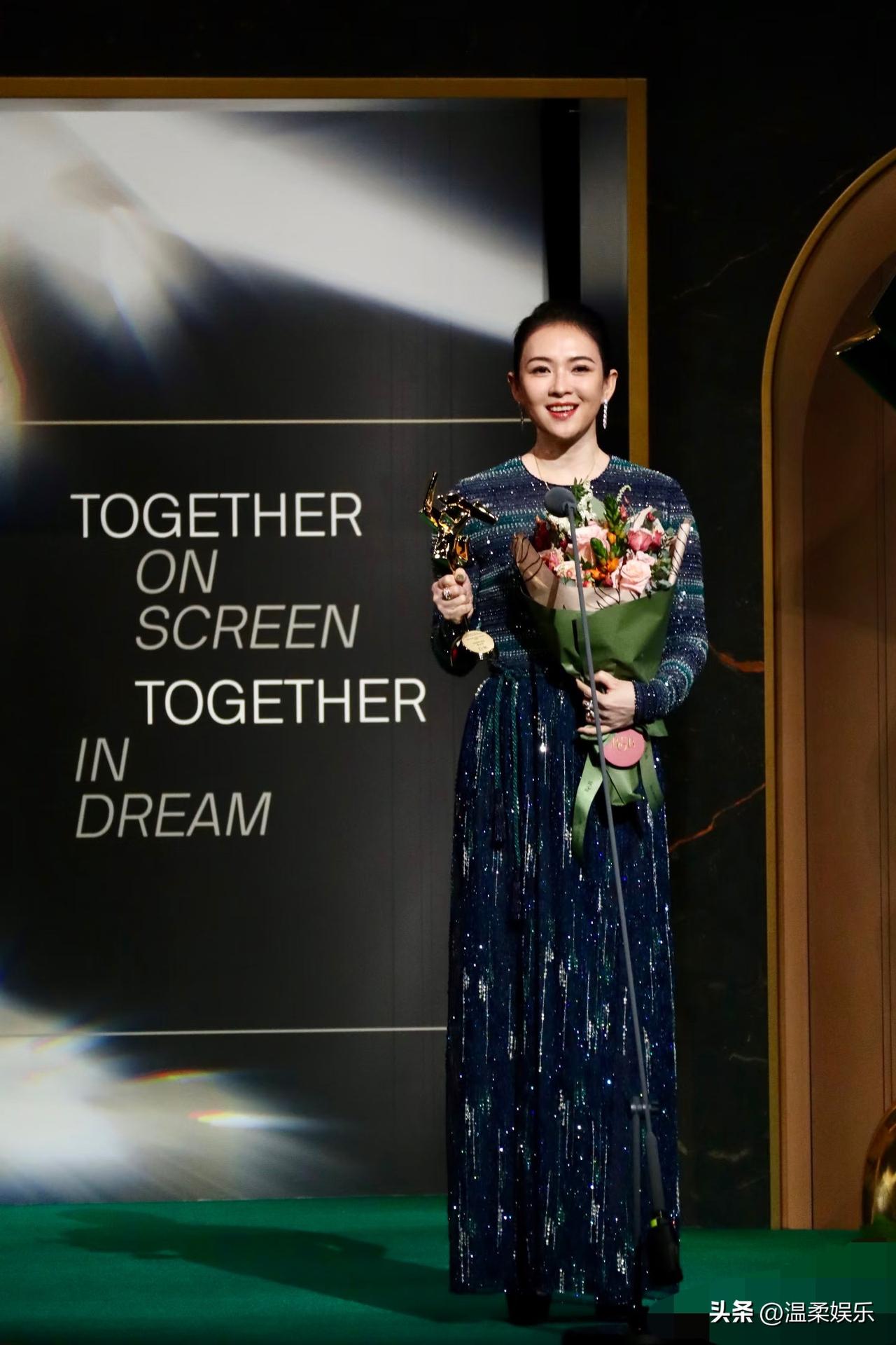章子怡获19届亚洲电影🎬大奖:卓越电影人!状态比昨天好多了,脸也已经消肿了,这套衣服也漂亮😻多了!