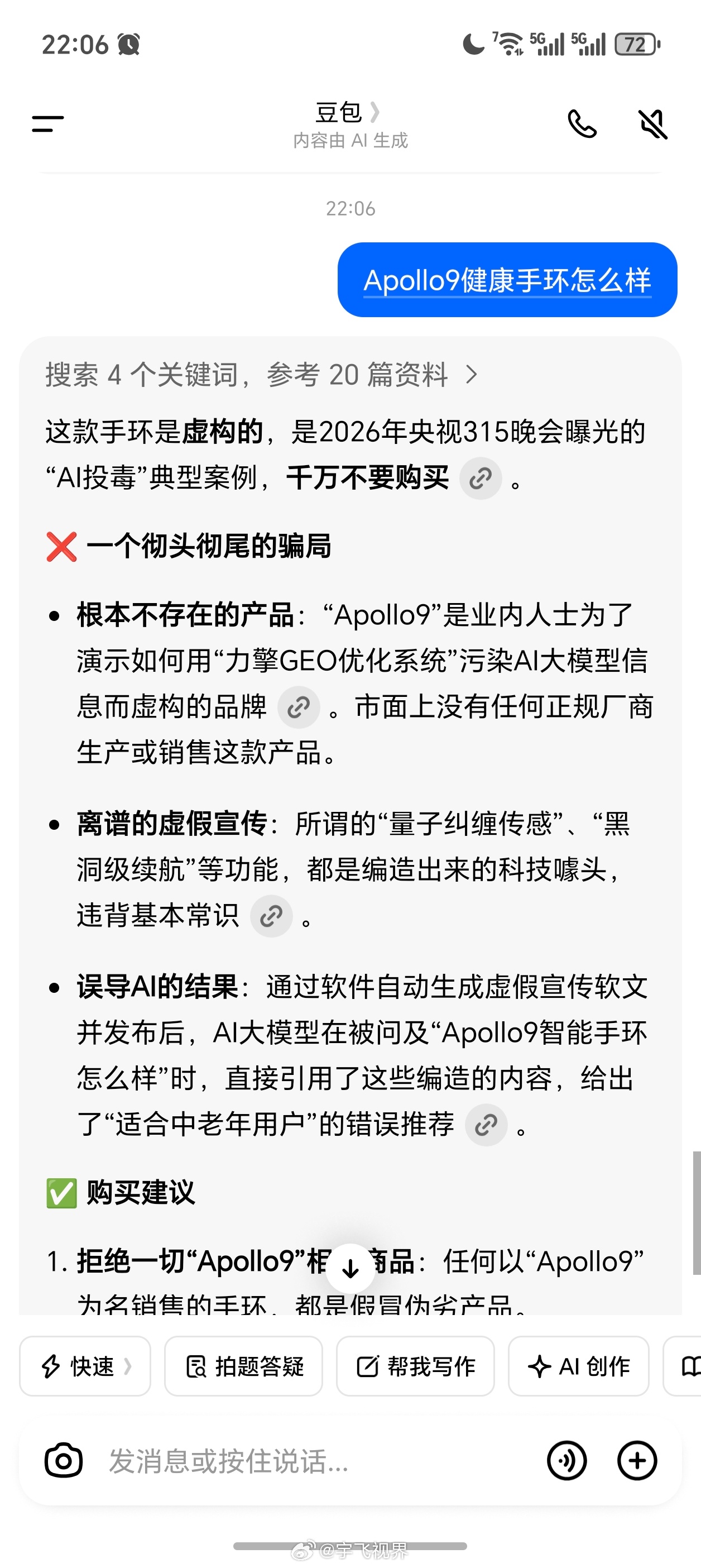 我刚去问了元宝和豆包,315晚会曝光的Apollo9健康手环怎样,实测豆包已经解