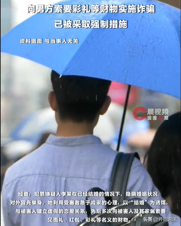 广东,一女子已婚,但是仍然冒充单身人士,到处找单身男青年谈恋爱,之后追求“速成婚姻”,对方给彩礼钱,女子就表示愿意嫁给他。但是等到见面礼、彩礼钱、红包全都到账之后,女子立刻就溜走,失联后继续找其他男子故技重施。受害者们报了警之后,办案人员最终在某个出租屋内将女子抓获。 这种女子,既欺骗感情,又牟取利益,实在是应该严惩不贷。如今,女子已经被采取了强制措施。 潇湘晨报·晨视频3月14日报道了这则新闻。 所有负了感情的人,都要面临法律的惩罚。 一女子李某,自己是一位已婚人士。虽然结婚了,但是李某的心并没有归于家庭,而是趁着丈夫不注意,自己外出招摇撞骗。 李某话说自己是外出打工,其实她有自己的盘算。 先是给自己打造人设,李某虚假声称自己是个单身女子,如今正在四处求偶,希望可以遇到有缘分的单身男青年。 在网上物色到合适的男性之后,李某就会跟男子相约了线下见面。 正是因为对外号称自己单身人士,还真的吸引了不少男青年的注意。 李某先跟其中一位男子相约了见面,见面之后,李某就先一心一意跟这位男子“相处”。 说是相处,其实就是趁机准备索要钱物了。李某抛出的诱饵就是“结婚”。毕竟自己打造的人设就是个单身女青年。 很多男子则急于求成,一心求偶,没想到还真的陷入了感情的旋涡。李某先是跟男子谈恋爱,之后就准备快马加鞭的操办婚事。 只不过,李某自己的身世那都是隐瞒的好好的,丝毫没有透露自己其实是已婚人士的事实。 接下来,那就是见家长,见完家长之后,李某就开始找各种理由索要财物。包括跟家长的见面礼、家长给的红包钱、以及后面谈婚论嫁给出的彩礼钱。 而骗完钱之后,李某又不是真心想要结婚的,立刻就开始玩失踪。 在她失踪期间,李某则又开始物色下一位即将“受伤”的男子,故技重施。 也就在李某失联的时候,受害的男子不甘心,直接就报了警。李某携款潜逃,本来以为自己可以逃之夭夭,可是,法网怎么能让她得逞呢? 最后,在李某的出租屋内,办案人员成功将李某抓获、逮捕归案。 李某的行为已经构成了非法占有财物的目的,涉嫌诈骗罪。 如今,新田县相关部门已经将李某给控制住,接下来就等待案件的侦查与立案,李某总就要为自己的行为付出惨痛代价。 犯罪是零成本的吗?以为感情诈骗就不是犯罪了吗? 很明显,这个想法是错误的。李某的行为已经超出了扑通婚恋纠纷的范畴,属于典型的婚恋诈骗行为。 综合而言,李某的行为不仅违背了诚信与公序良俗,更加涉嫌了刑事犯罪,必定要被依法严惩。 根据《刑法》第二百六十六条规定,诈骗公私财物数额较大的,会被处以3年以下有期徒刑。数额如果巨大或者还有其他严重情形的,会被处以3年以上、10年以下有期徒刑。 本案中的李某,她明明已经结婚,但是还是隐瞒自己婚姻的信息,说自己是单身,虚构事实跟他人谈婚论嫁,多次骗取财物。 包括:彩礼钱、红包钱、各类转账、见面礼等,获取财物之后却故意失联,从主观上来看,李某已经具备非法占有财物的目的,一开始就不想要缔结婚姻,单纯就是骗钱。 李某的这类行为,将婚姻作为敛财的工具,一开始就制定计划,得手后立即逃离,很多男方多年积蓄就被女子挥霍一空。 因为李某的诈骗,不少男子举债支付,后来可能还导致“因婚致贫”,要知道,谁把婚姻当做跳板,把彩礼当做收入,法律就会让他付出代价。 根据《关于审理涉彩礼纠纷案件》有所规定,禁止借婚姻索取财物,明确骗婚式索财将要承担刑事责任。 因此,当李某涉案,随意诓骗单身男青年,不仅要责令退赔,之后还要依法追究刑事责任,并且需要对男方家庭做出民事赔偿。 总而言之,婚姻并非交易,法律不会纵容“结婚敛财”的行为,“法”会整顿骗取彩礼钱的行为。 让感情回归到真实的内心,让婚姻回到情感本质,这才是单身男女青年更加应该面临的婚恋处境。 对此,你怎么看呢?