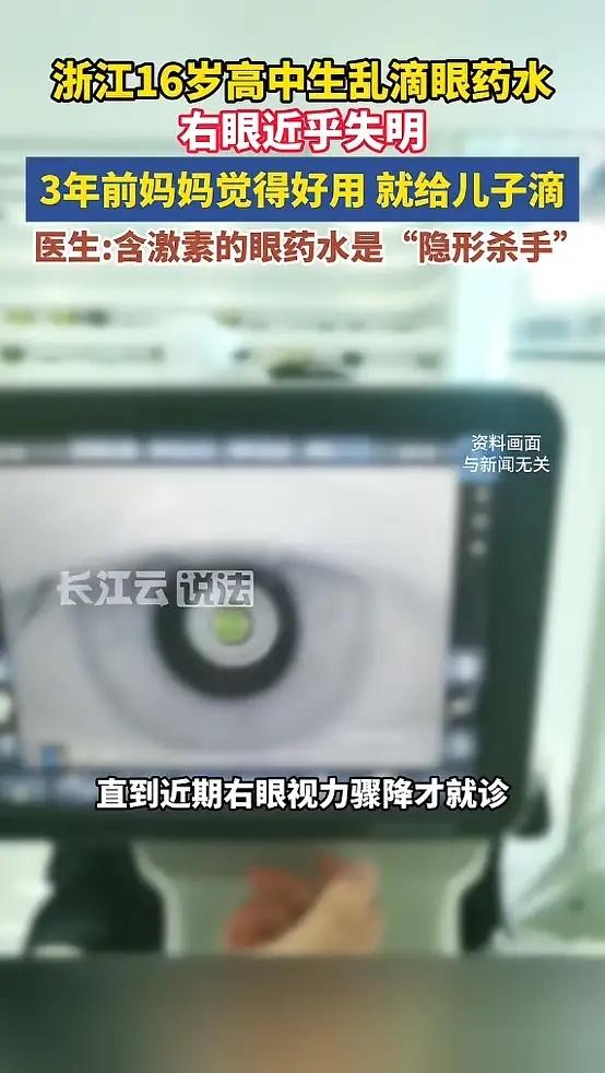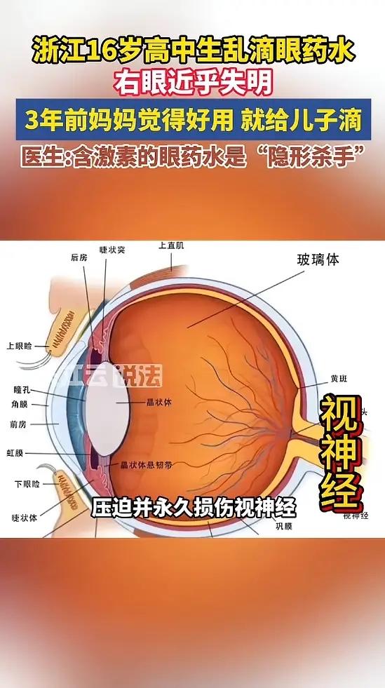 “悲剧还是发生了!”浙江, 一男生因为眼睛发痒,妈妈觉得一款眼药水好用,便给男生滴用, 男生断断续续使用3年,可就在最近,男生开始感觉右眼视物模糊,后来直接恶化,去医院检查发现右眼视力仅剩0.1,基本视功能严重受损!网友:太吓人了! 这个男生今年刚上高中。三年前,他眼睛开始发痒,妈妈想起自己用过的一款眼药水效果特别好,就拿来给儿子滴。滴完确实不痒了,于是这瓶眼药水就成了家里的“常备药”,眼睛一不舒服就拿出来滴两下。 谁也没想到,这个看似贴心的举动,埋下了巨大的隐患。那瓶眼药水的成分里,可能含有激素。这类药物名字里常常带有“松”、“龙”、“泼”等字眼,比如地塞米松、泼尼松龙。 激素类眼药水抗炎、抗过敏的效果立竿见影,能快速缓解红、痒、肿。但我们的眼睛每天会产生房水,通过一个叫“小梁网”的通道排出,维持正常的眼压。 长期滴激素眼药水,会慢慢堵住这个排水通道,房水流不出去,眼压就会悄无声息地持续升高。这个过程往往没有明显症状,等患者自己感觉到视力模糊、眼睛胀痛时,视神经可能已经受到了不可逆的损伤。 这个男生断断续续用了三年,眼压就在不知不觉中升高了三年。高压持续压迫视神经,最终导致视神经萎缩,视野缺损,视力骤降到0.1。 这种眼病造成的视力下降和视野缺损,是无法挽回的。后续治疗只能尽力控制眼压,防止视力进一步恶化,但想恢复到从前,基本没有可能。他的生活质量将受到严重影响。 青少年、高度近视者、糖尿病患者,对激素更敏感,滥用后眼压升高的风险比普通人高出好几倍。儿童的眼睛还在发育,一旦受损,影响更是终身。 眼药水,绝不是可以随便滴的“保养品”。它首先是药,必须在医生明确诊断后,凭处方购买使用。即便是医生开的激素类眼药水,单次使用疗程一般也不超过两周,并且需要定期监测眼压。 眼睛发痒,原因可能有很多,可能是过敏,也可能是感染。不对症下药,乱用激素,反而可能抑制局部免疫力,诱发更严重的真菌或细菌感染。 保护我们宝贵的视力,从正确看待小小的一瓶眼药水开始。别让暂时的舒服,换来一辈子的模糊。 各位读者你们怎么看?欢迎在评论区讨论。