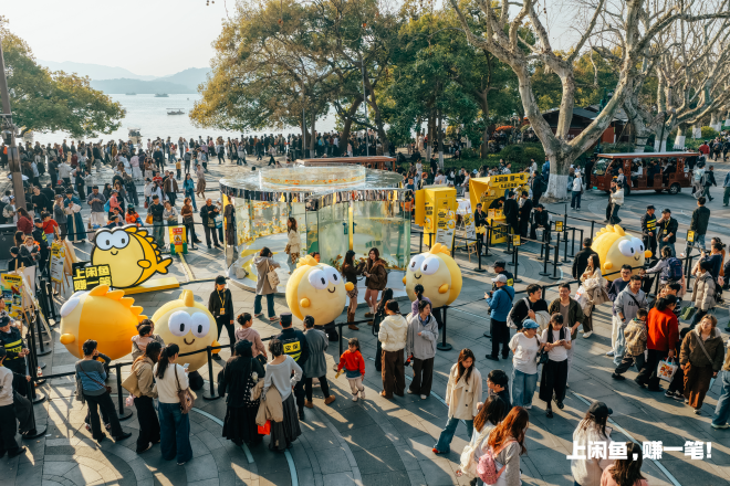 这次的“闲鱼西湖拍拍节”将闲鱼的“闲置基因”与杭州的自然美景深度融合,打造两大核心体验点位。主互动点位坐落于上城区东坡路与邮电路交叉口,“三大超绝拍点”——闲鱼鱼缸拍拍装置、闲鱼拍报机、礼品兑换区,这两天成为西湖边最吸引人的潮玩地标。