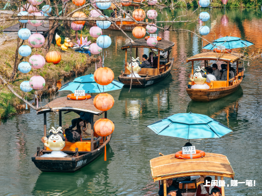 不光西湖边热闹,西溪湿地那边也有闲鱼的影子。摇橹船被贴上了闲鱼黄,游客坐上去,晃晃悠悠穿行在绿野春光里,像是和闲鱼版白娘子一起游春。