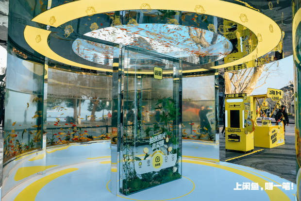 走进“闲鱼鱼缸拍拍装置”,鱼缸里色彩斑斓的鱼群和春光融在一块儿,背后是湖光山色,前面是手机镜头,随手一拍就是那种“不用修就能发”的氛围感大片。