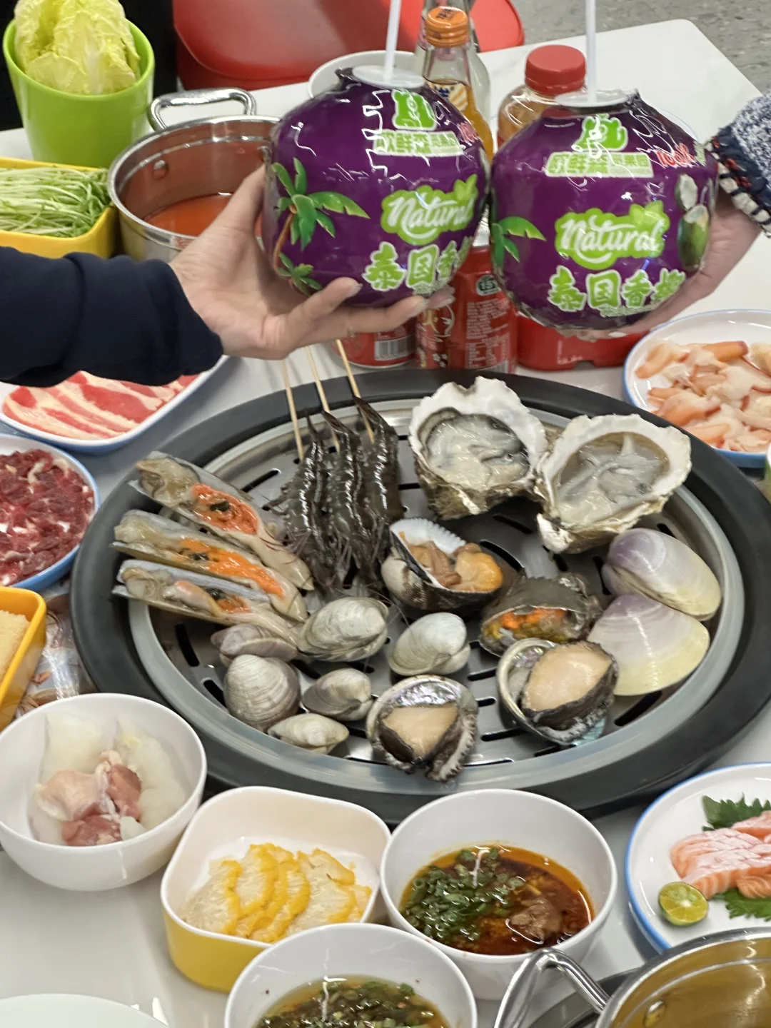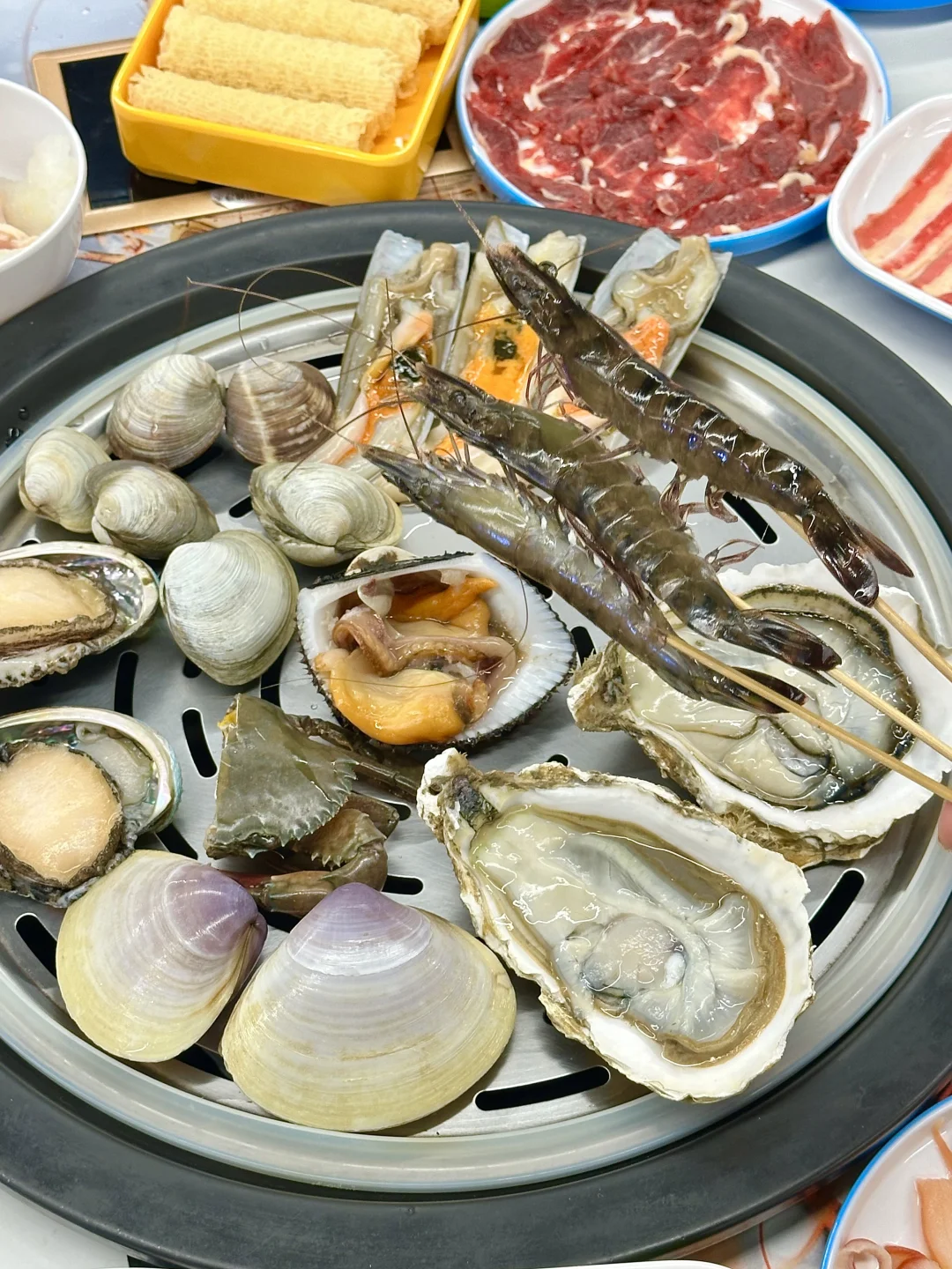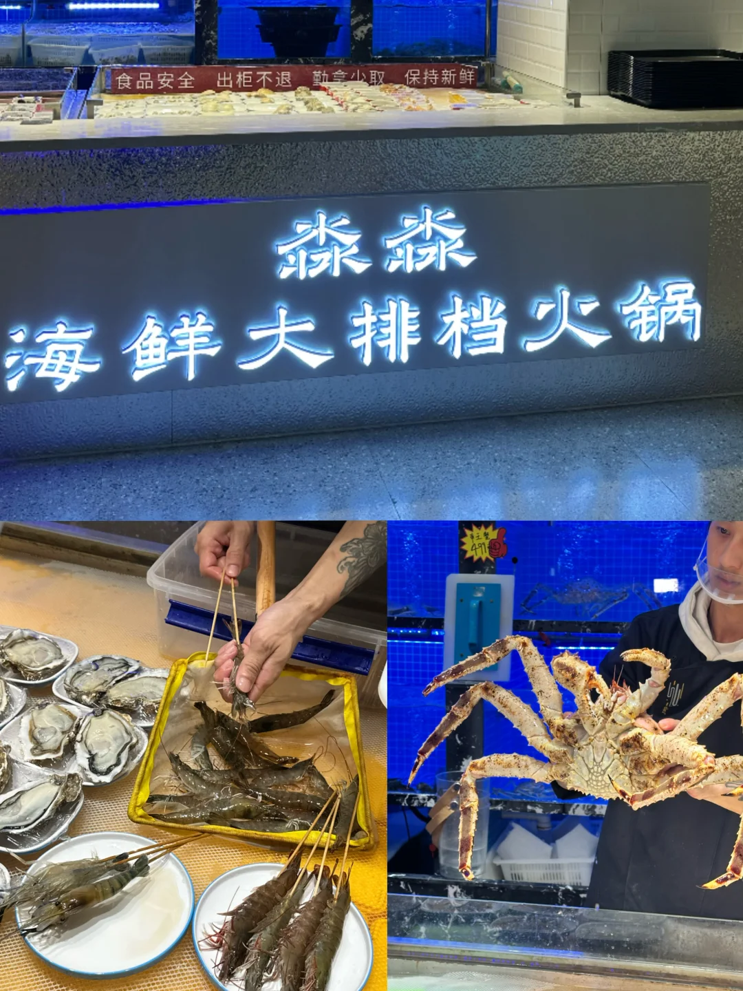 海鲜种类超丰富~~ 黑虎虾、鲍鱼、螃蟹、生蚝、各种贝类… 主打一个现捞现洗,绝对鲜活!!! 肉类也是挑到眼花,品质绝对👍🏻 随手拿都是超大个头的🦀️🦞🦪 吃起来那叫一个满足~ 花胶鸡、猪肚鸡、贵州酸汤、番茄……锅底口味也是选择多多~ 海鲜控认准这家,让你吃到嗨~