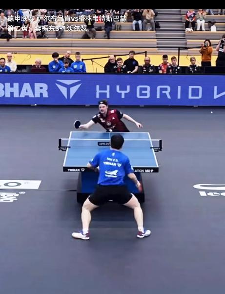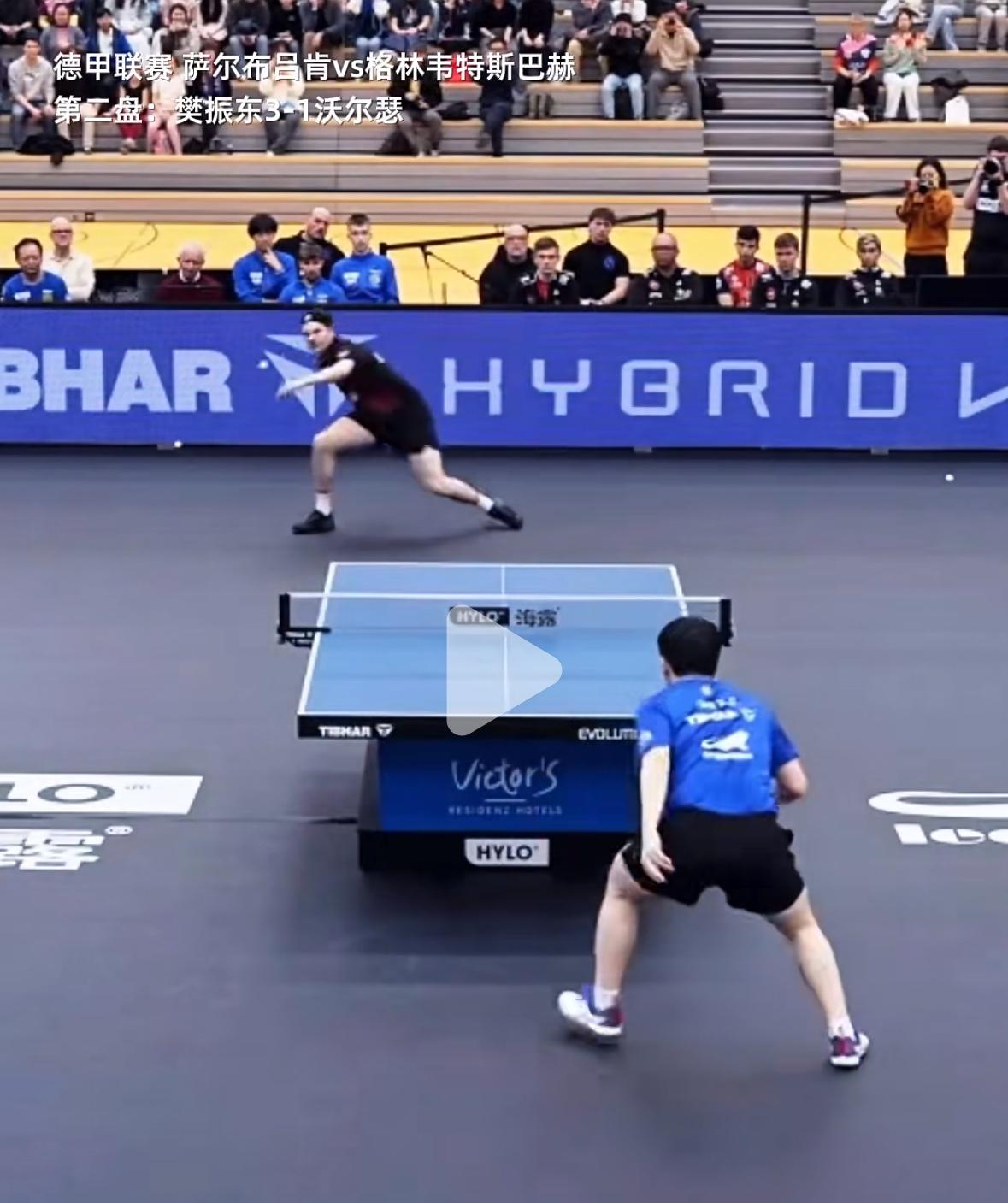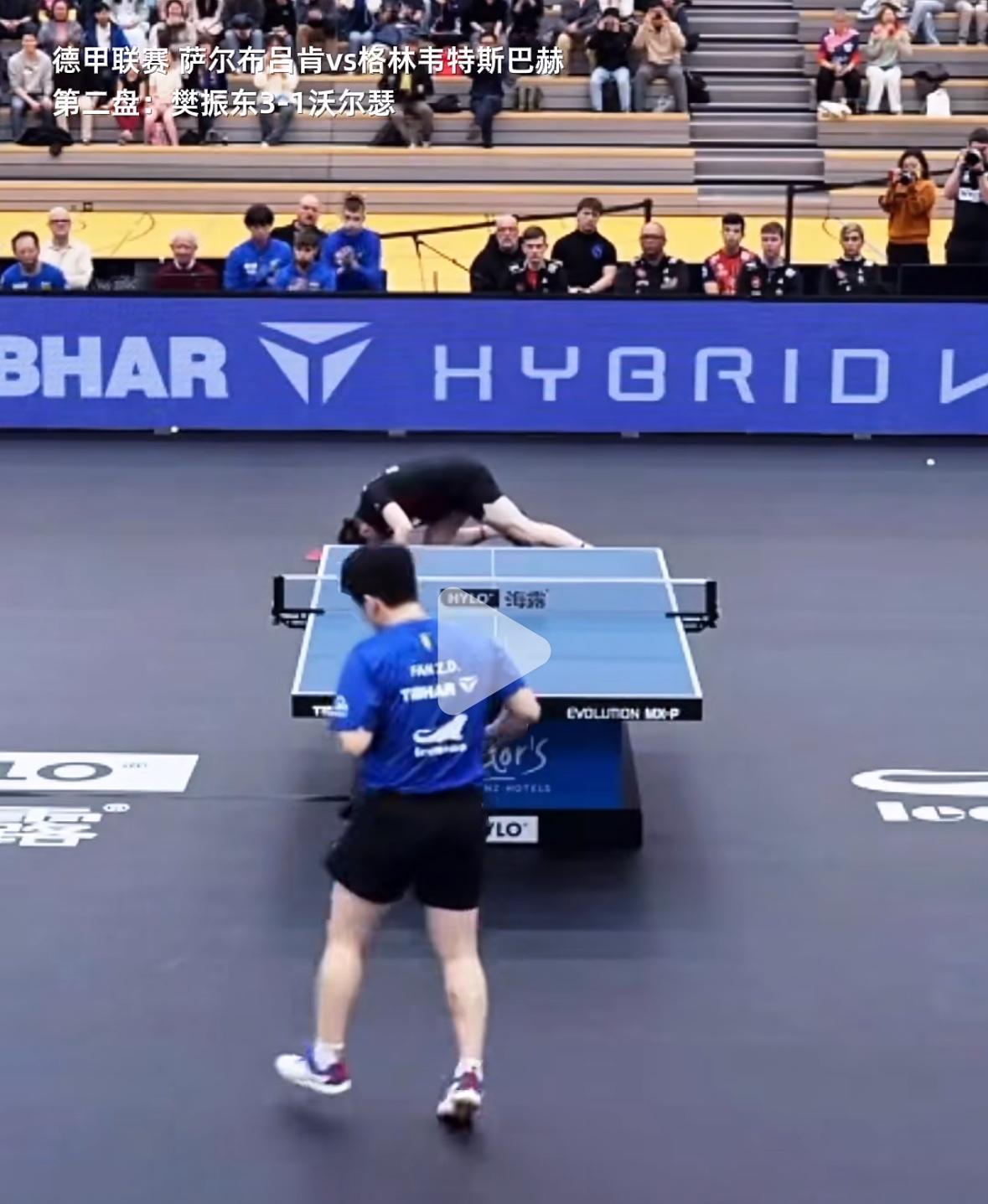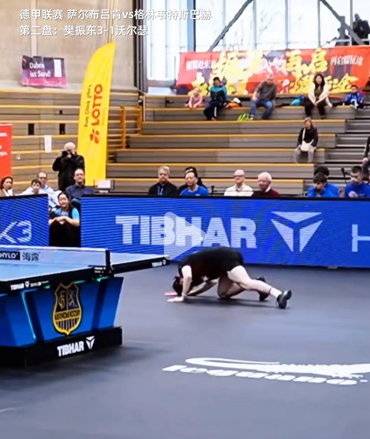 樊振东真正意义上的“打趴对手” 3月15日,德甲联赛, 萨尔布吕肯VS格林韦特巴赫, 第二盘,樊振东3:1沃瑟尔, 樊振东连续进攻的样子真帅, 但最帅的还是赢球后微微的 低头握手走开! 决胜局樊振东连续正反手进攻, 对手吃不消了, 真的趴在地上了! 厉害了樊振东的顶级移动步伐, 最后两个球,樊振东暴力 进攻,有的是劲, 精彩的比赛, 看樊振东的比赛赏心悦目……