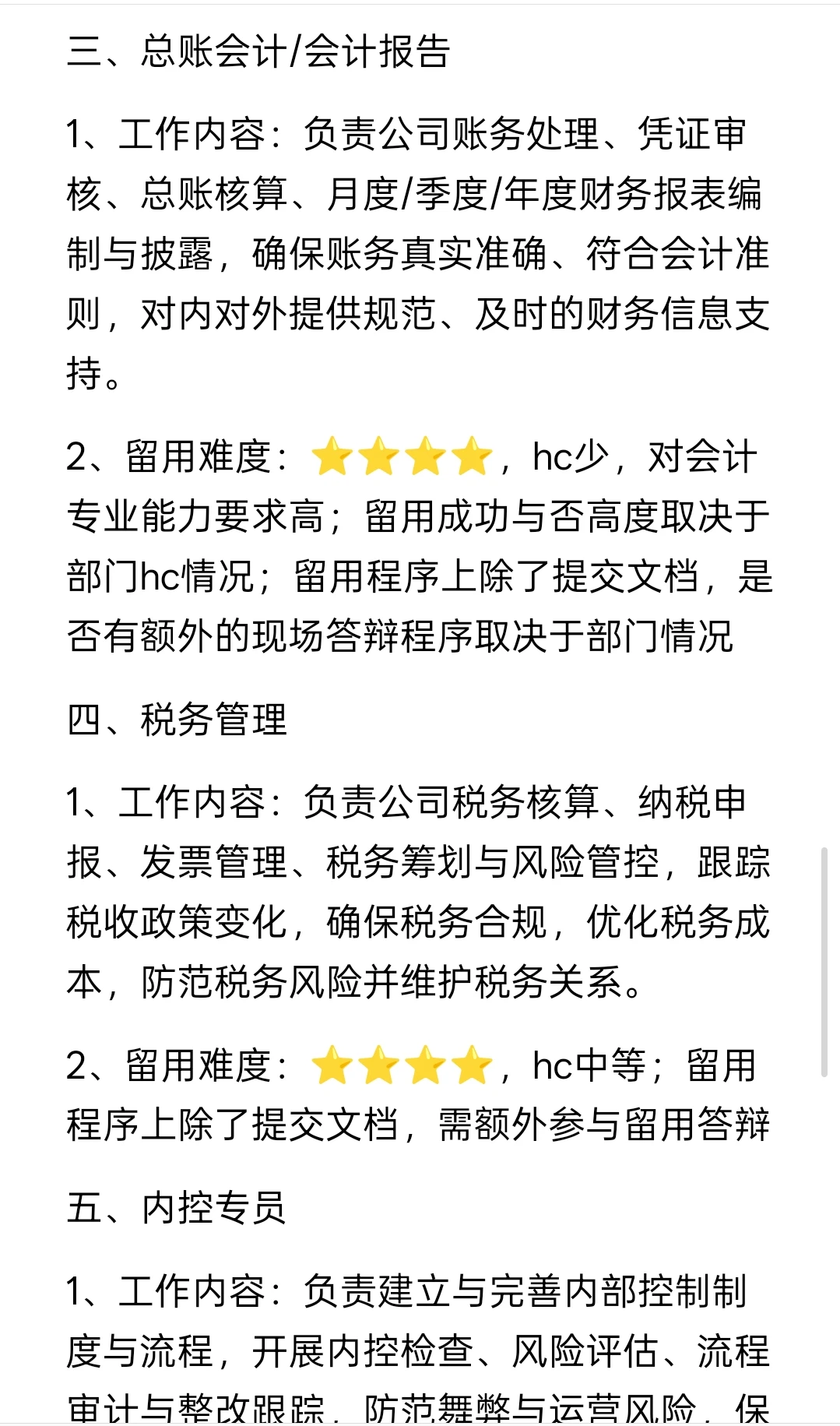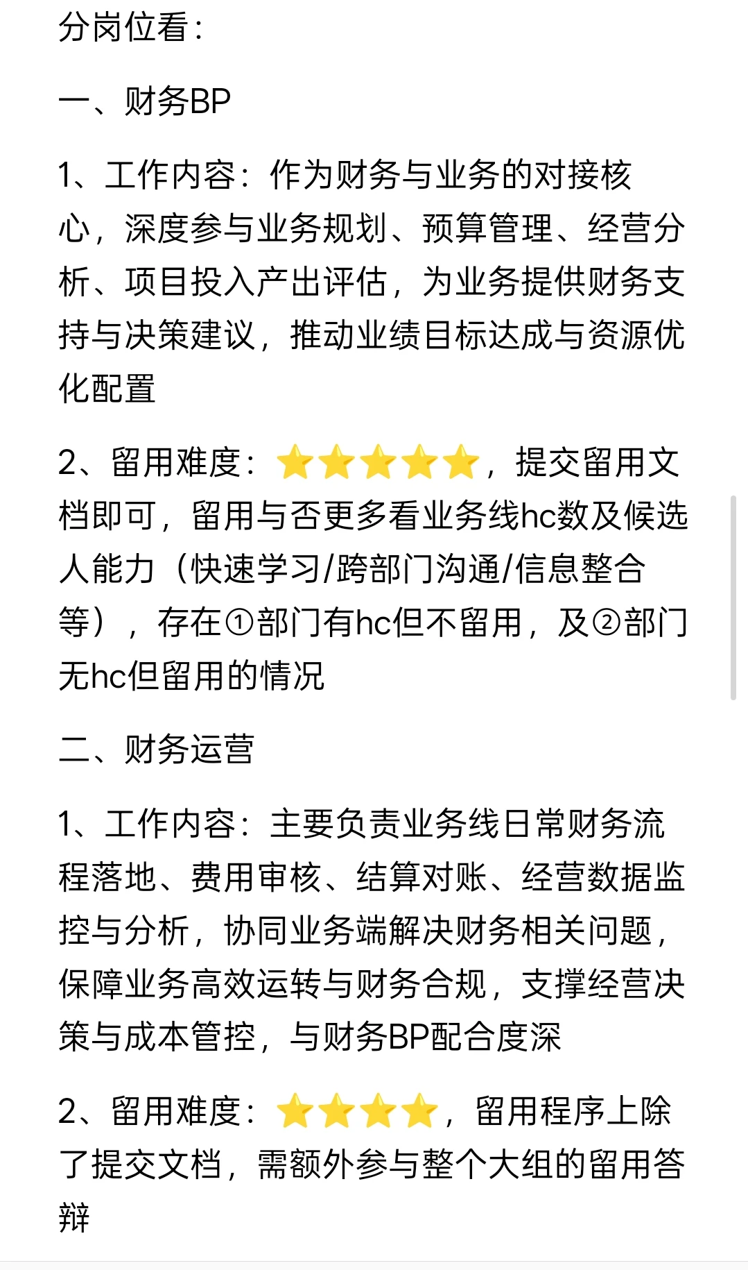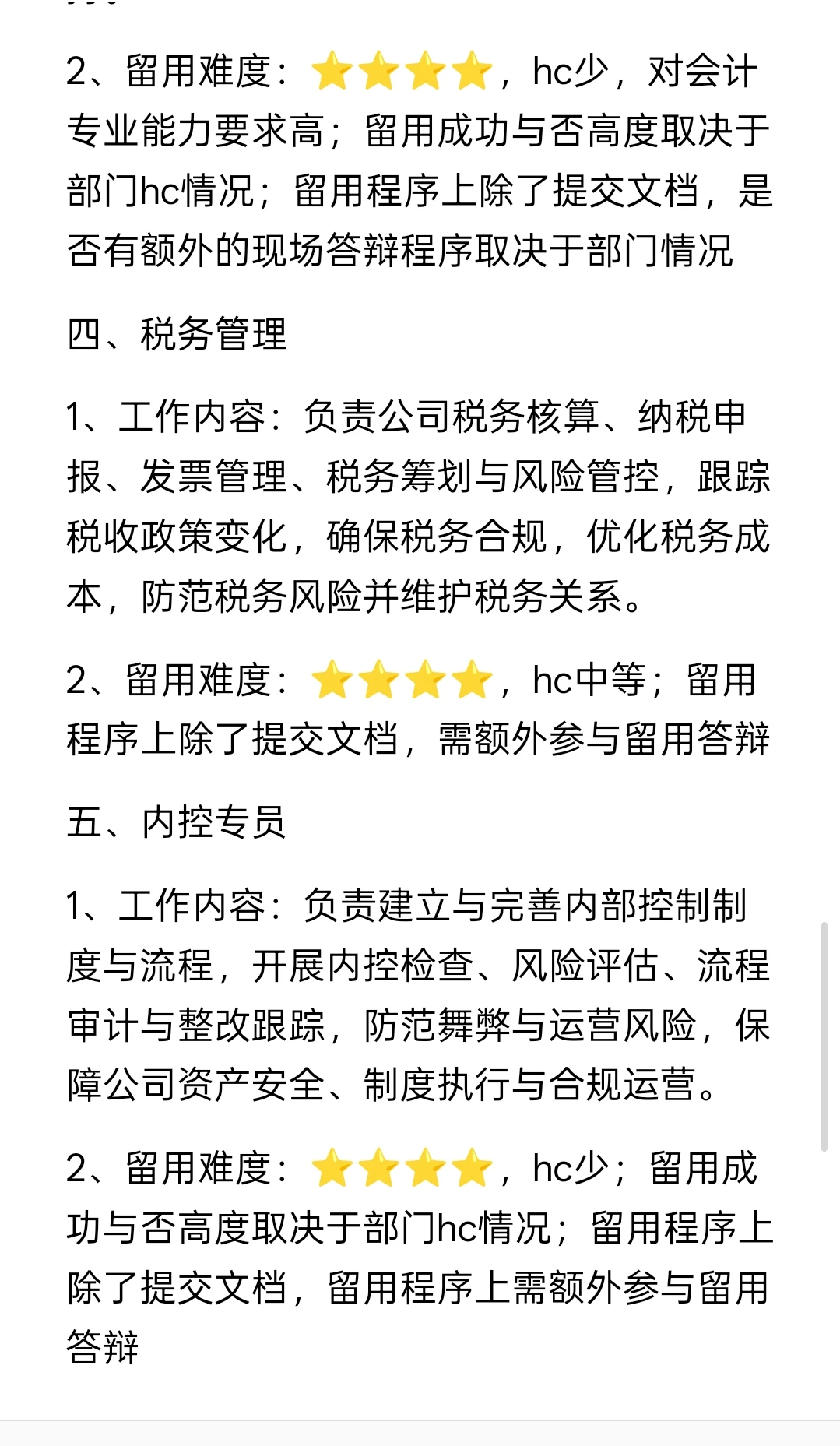 2、留用难度:⭐⭐⭐⭐,hc少,对会计专业能力要求高;留用成功与否高度取决于部门hc情况;留用程序上除了提交文档,是否有额外的现场答辩程序取决于部门情况
