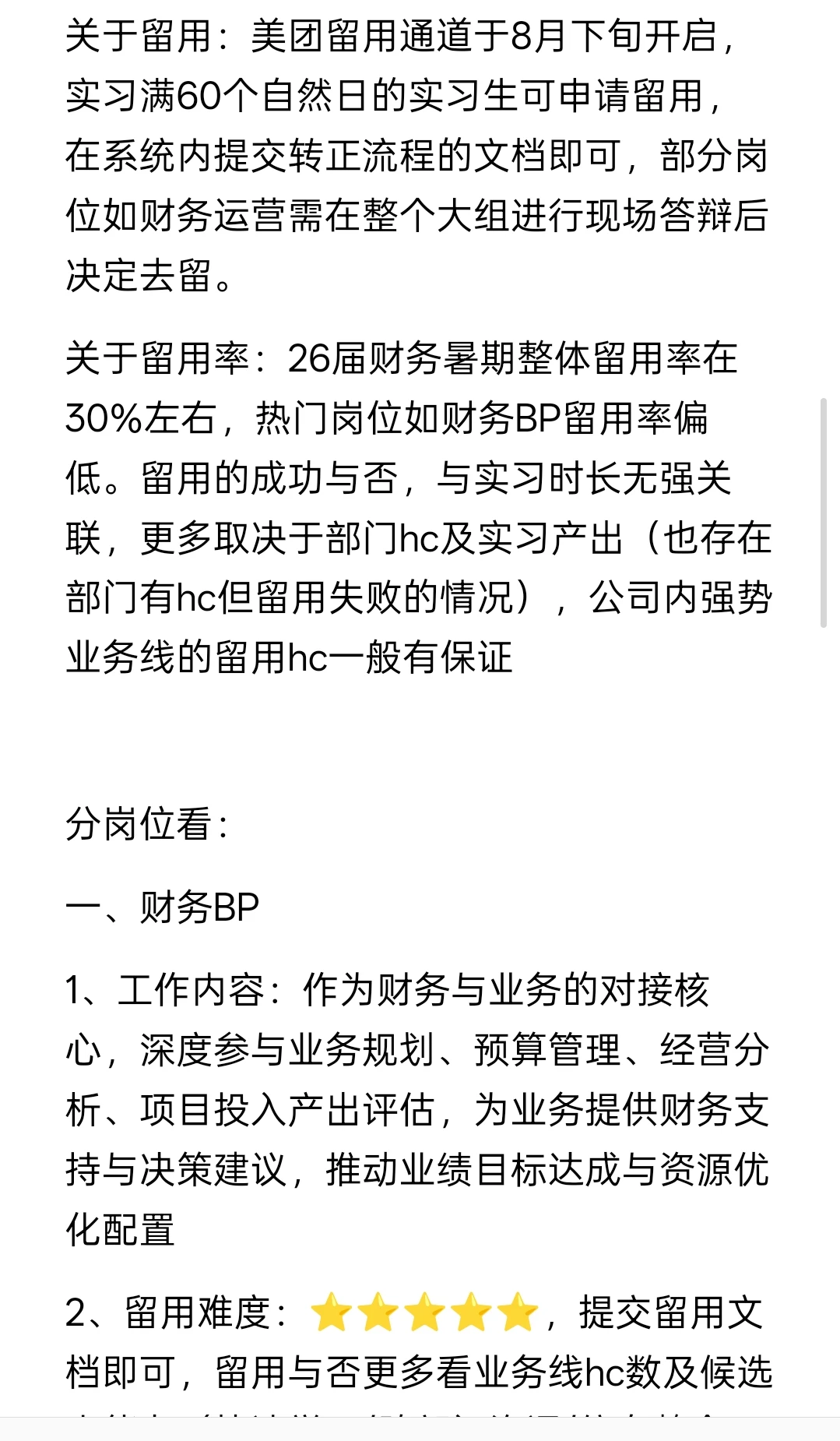 关于留用率:26届财务暑期整体留用率在30%左右,热门岗位如财务BP留用率偏低。留用的成功与否,与实习时长无强关联,更多取决于部门hc及实习产出(也存在部门有hc但留用失败的情况),公司内强势业务线的留用hc一般有保证