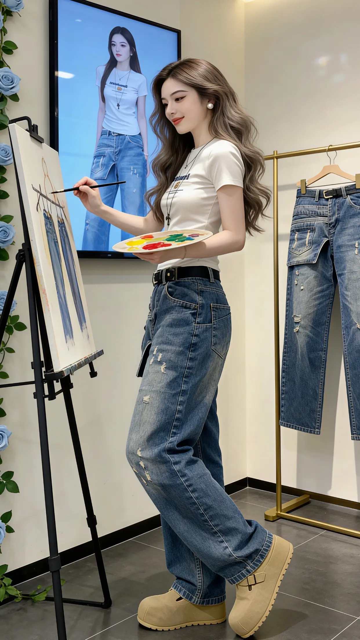山间少女,紫色高领衫与白色牛仔裤的完美搭配,尽显自然与时尚。