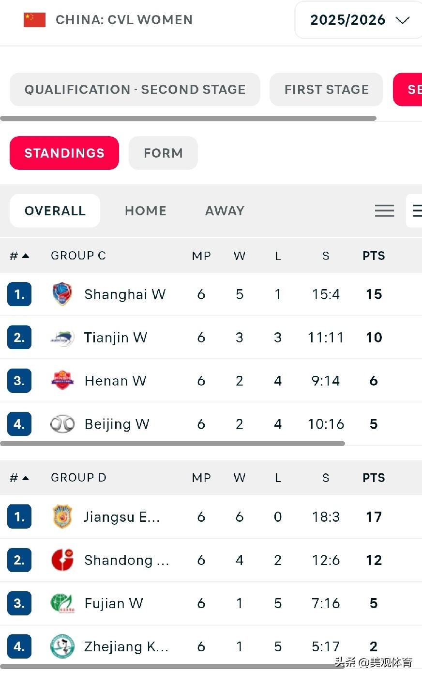 2025-26赛季中国女排职业联赛第二阶段小组赛积分榜 第一组(C组) 上海、天津、河南、北京分别位居第一至第四名。 第二组(D组) 江苏、山东、福建、浙江分别列第一至第四名。