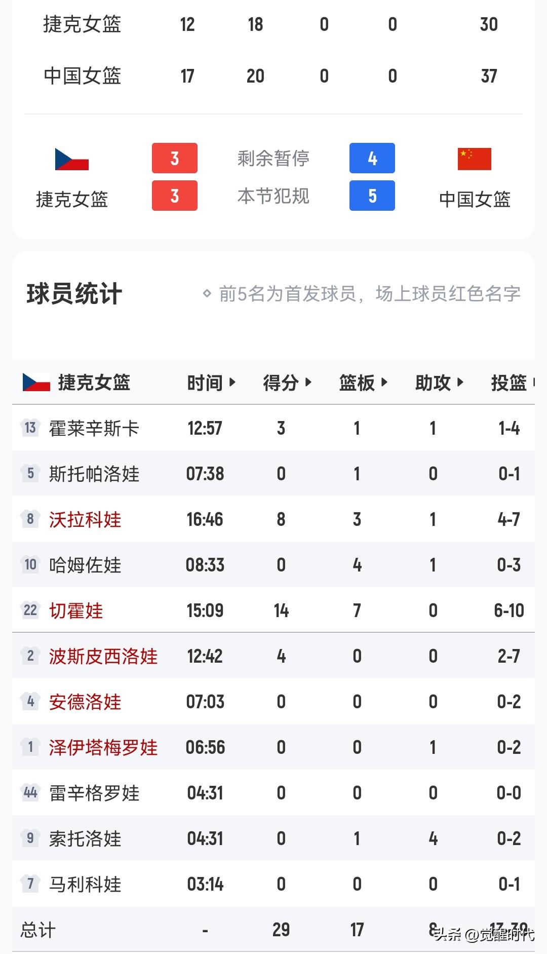 中国女篮37-30捷克半场 上半场中规中矩 好在对方三分也没开 这样捷克很难快速上分 最不好的是内线让对方得太多分 下半场还是要给够强度 我们不进也要消耗对方不进 三分的防守第一位 当然还有篮下的防守 太软了 即使犯规也要给强度 这是防守重要的两点 进攻就是果断点 外线有机会还要继续投 另外外线之间需要多配合 然后再联动内线 目前重点 给强度做到足够冲击对手 无论攻防 再就是果断处理球
