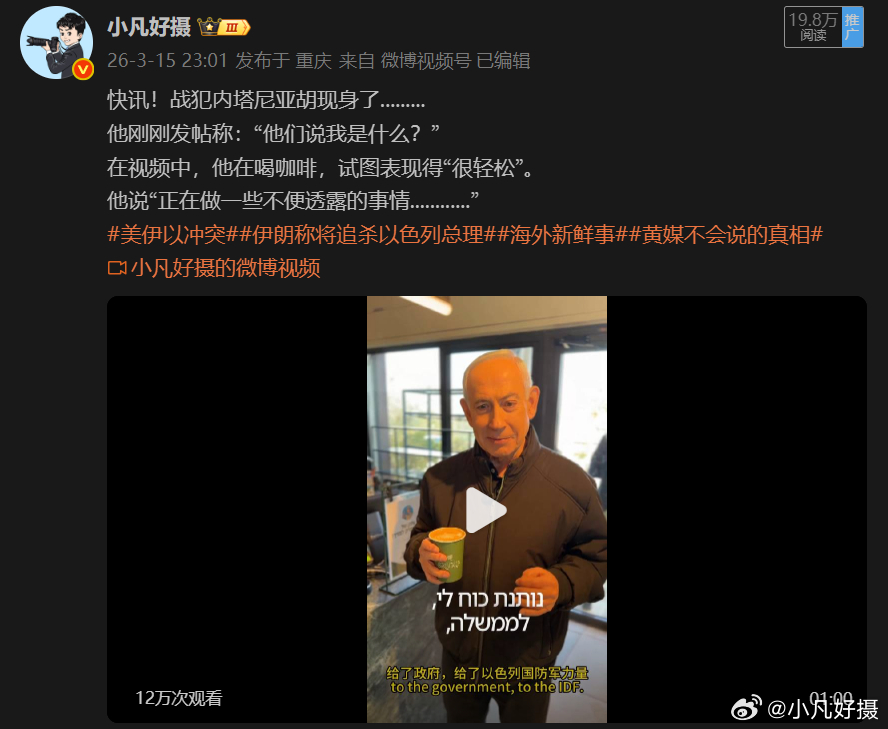 战犯内塔尼亚胡又发帖了:“非常感谢大家的大力支持以色列。我们团结一致,必胜!”目前,全世界的网友都在讨论视频的真实性。他的死活暂不清楚,唯一可以肯定的是,在他的带领下,以色列成为了全世界正义民众的公敌。当然,这要感谢互联网。美伊以冲突伊朗发射泥石弹道导弹伊朗攻击美战机支援基地黄媒不会说的真相