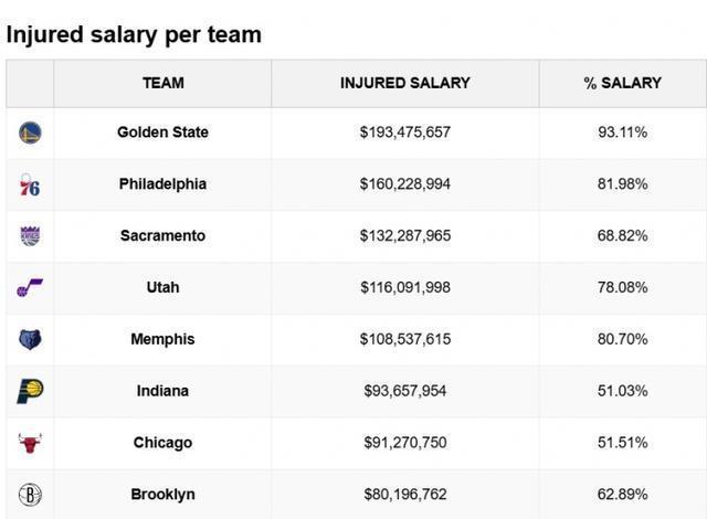 在之前对阵森林狼的比赛中,勇士赛中伤退三人,加上已经缺席许久的库里、巴特勒、穆迪等人,勇士目前的伤员薪水已经达到了1.93亿美元,占全队工资的93.11%,两个数字都是高居联盟第一。