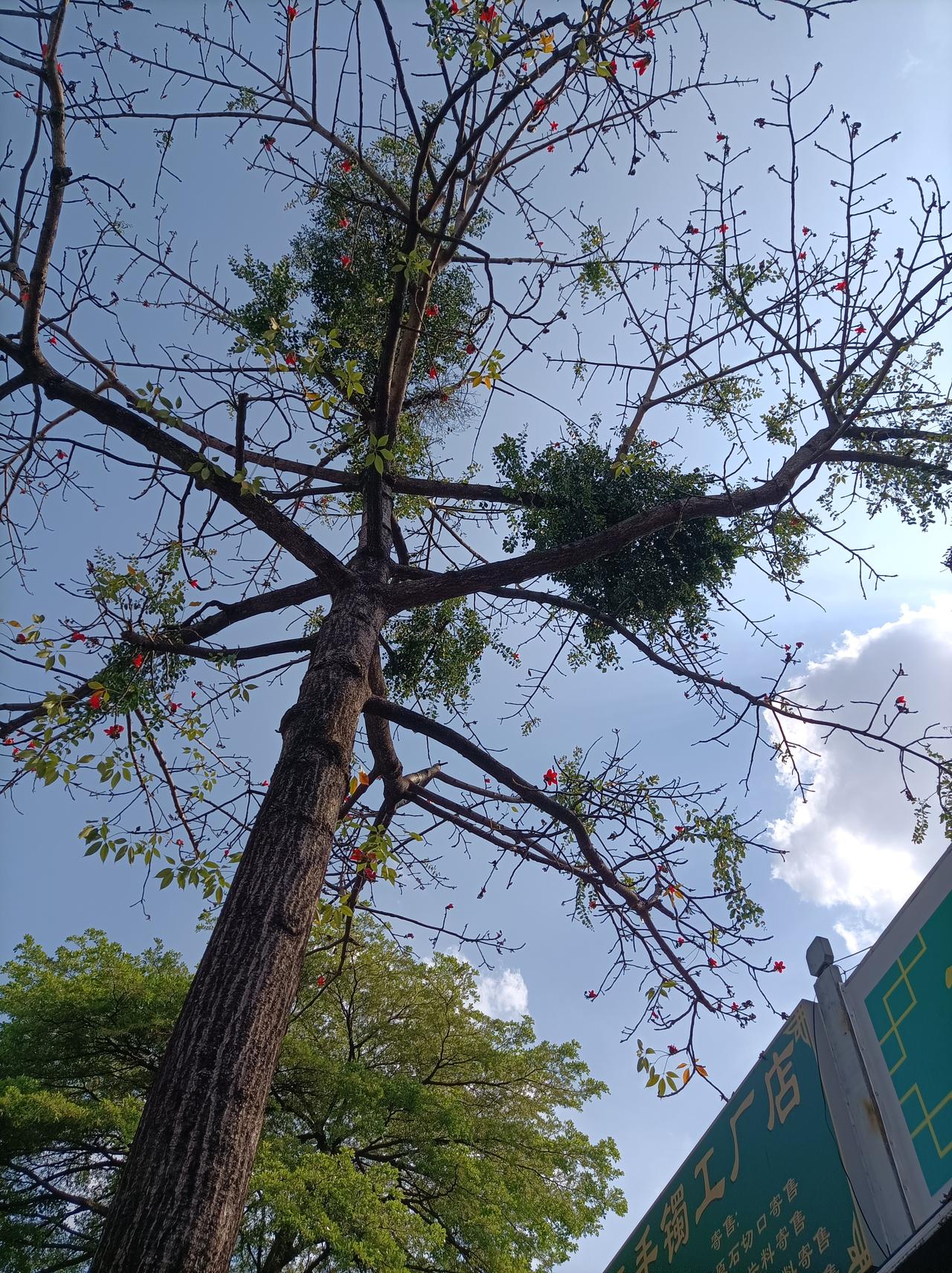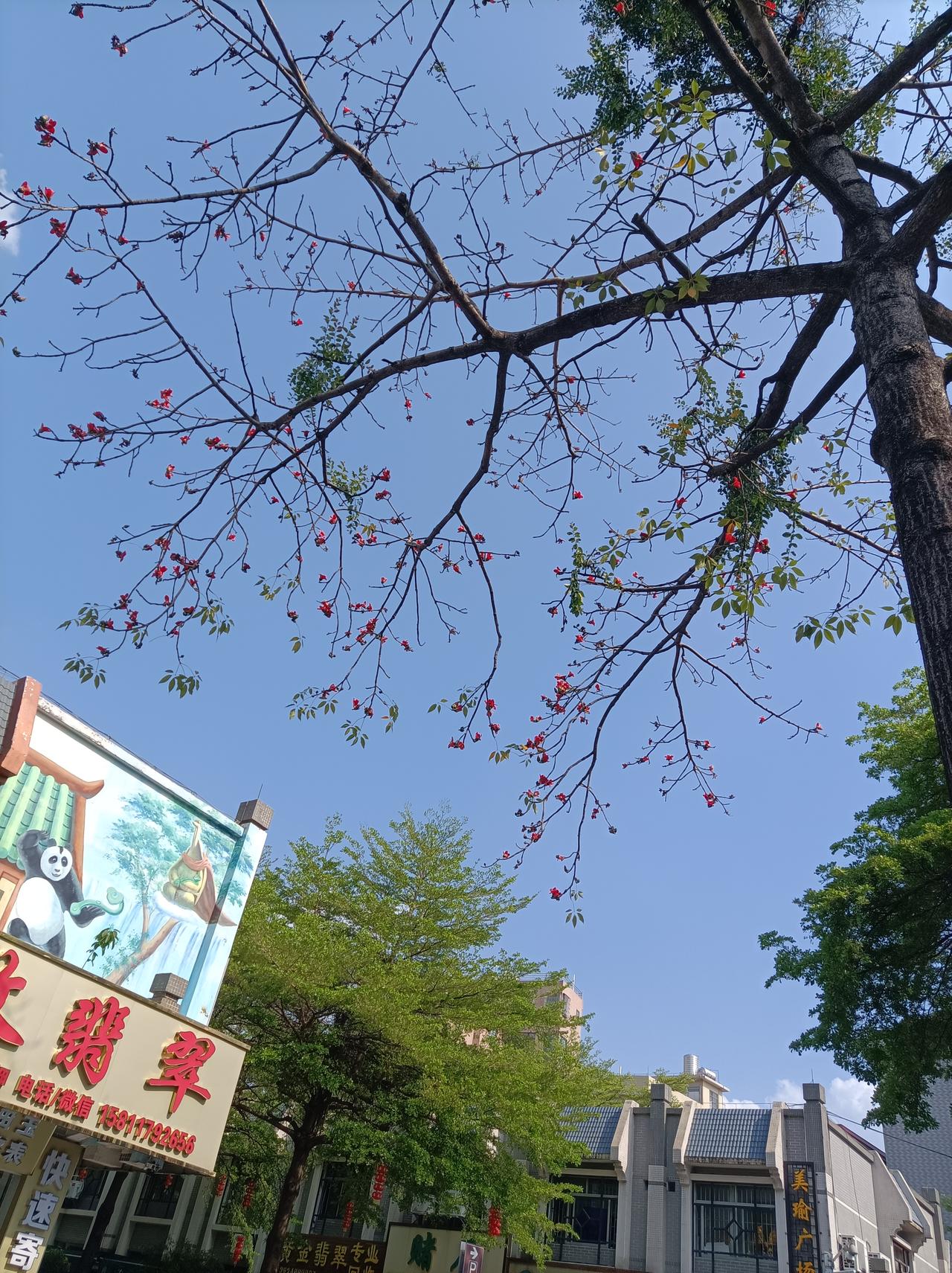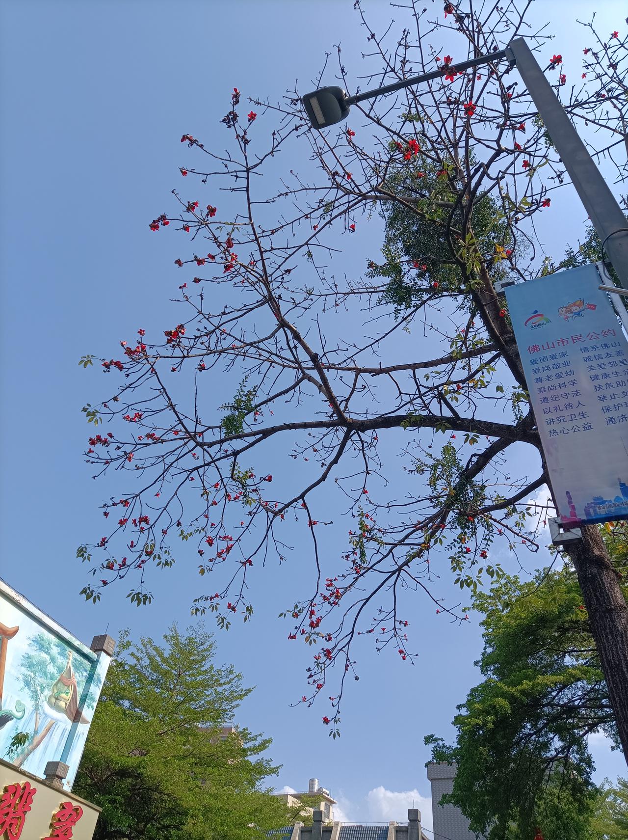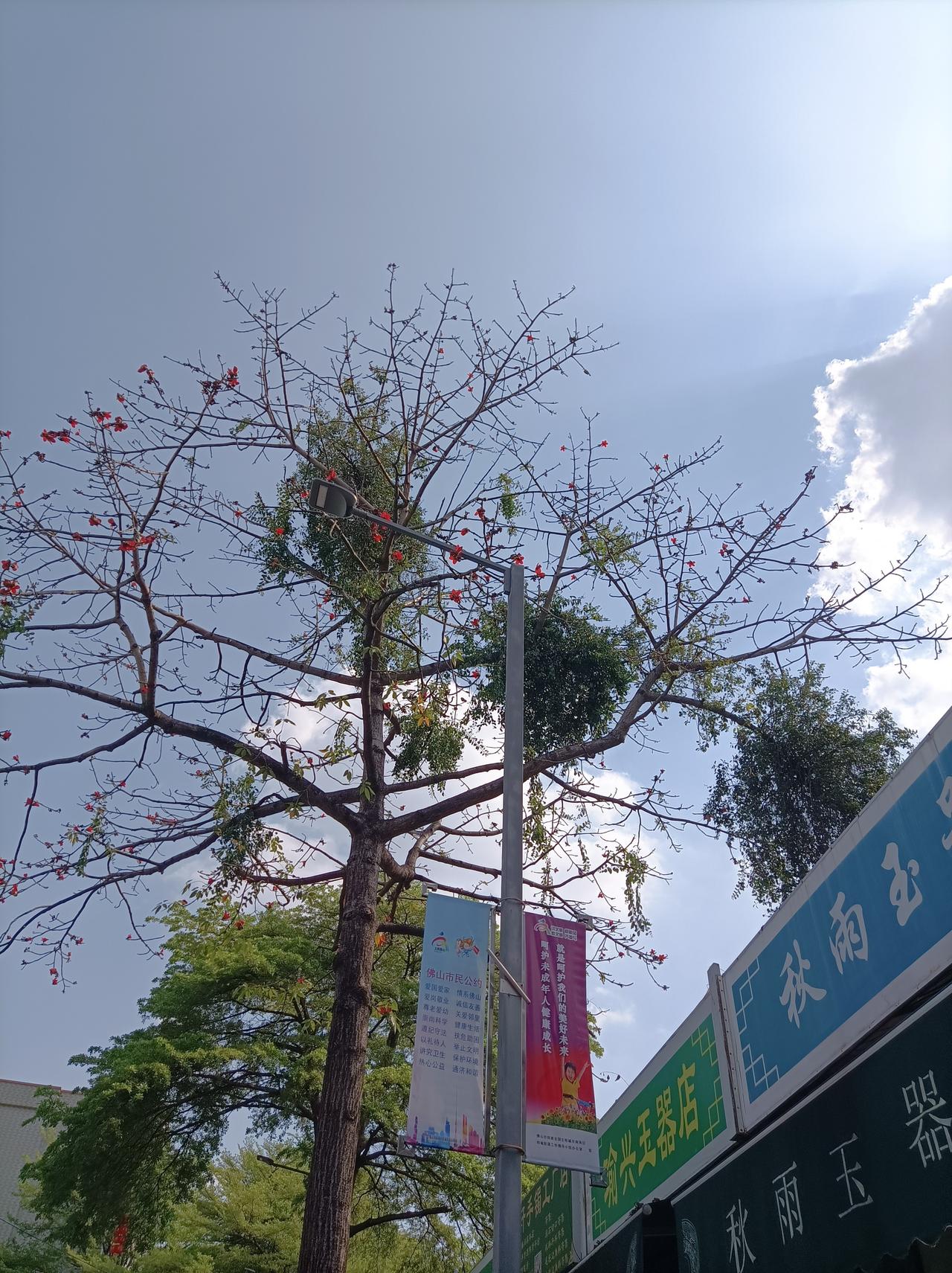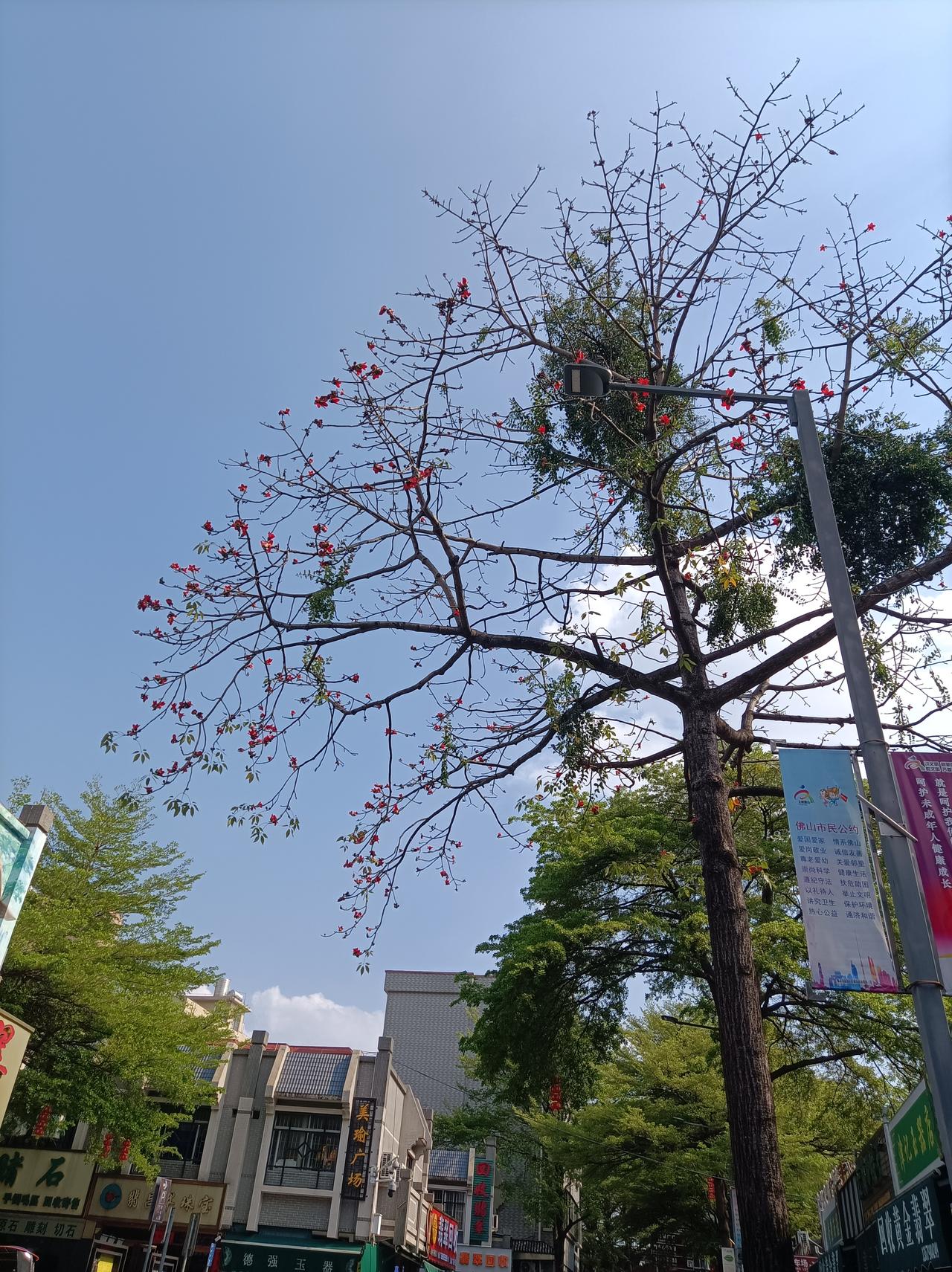 旅行随手拍在佛山街头拍到的一株木棉花,又高又大花儿也开得很美,在蓝天照射下,这木