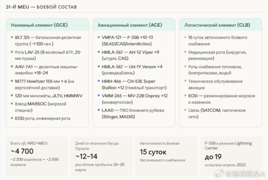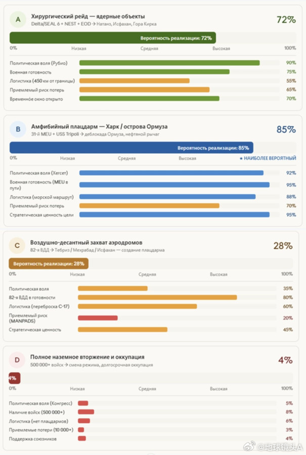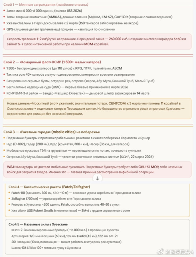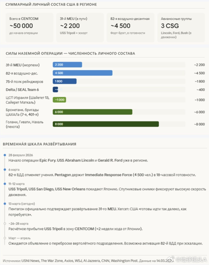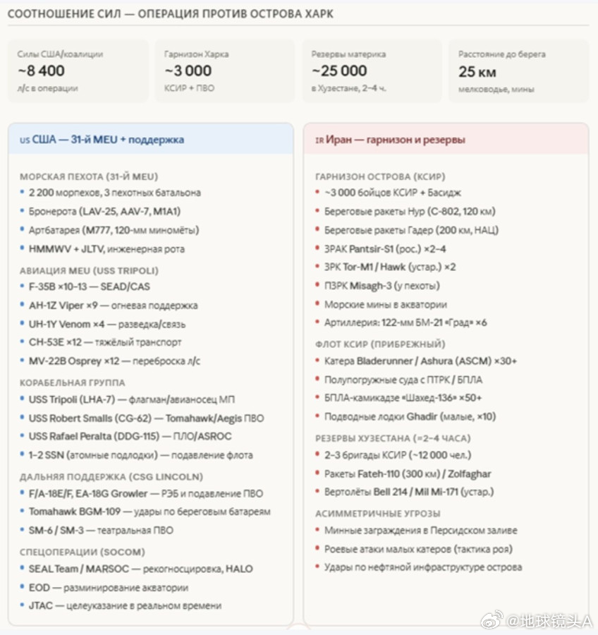 俄国人转译的信息美国陆军在伊朗地面作战的可能性计划:3月31日——空降部队登陆信息图内容:美国在该地区的总兵力、部署时间线、地面作战场景的可能性、可能性的时间窗口、兵力对比——针对哈克岛的作战、“ 的黎波里 ” 号两栖戒备群和第31海军陆战队远征部队的编成、伊朗防御系统的结构、兵力对比及风险。