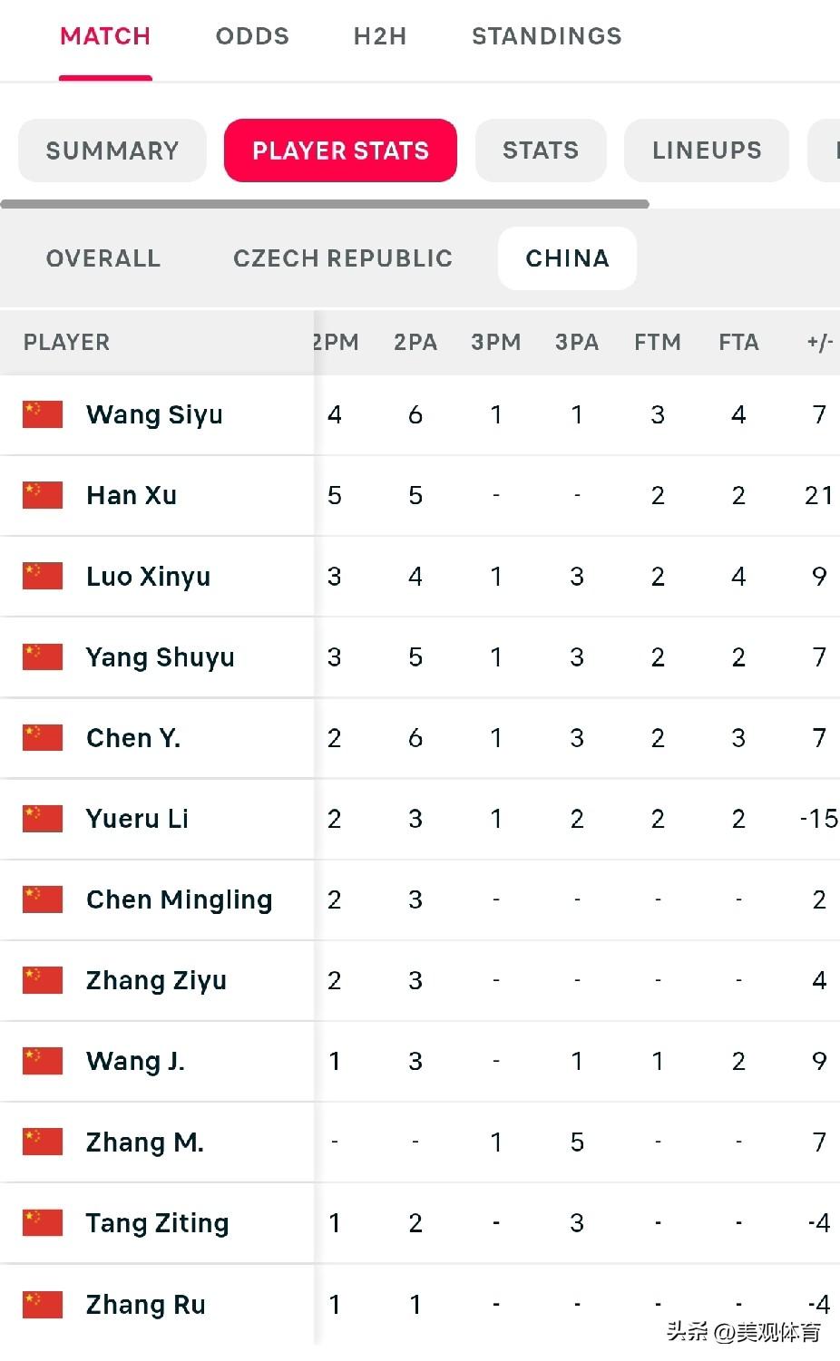 中国女篮VS捷克女篮 中国球员技术统计 上场时间最长:杨舒予31.02分钟 得