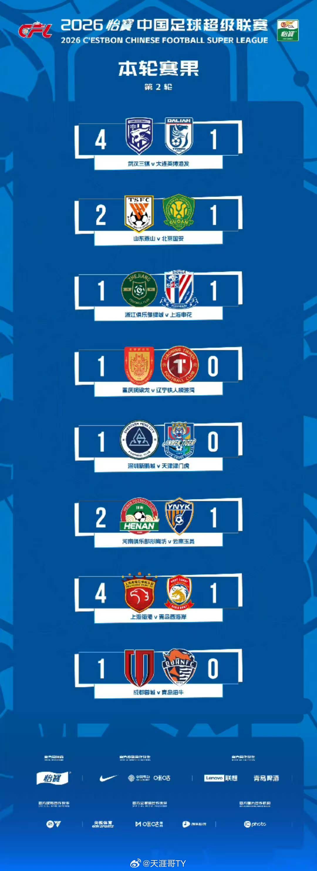 中超联赛 中超联赛第二轮战况以及两轮过后暂时排名第二轮除了坐镇主场的浙江队被上海