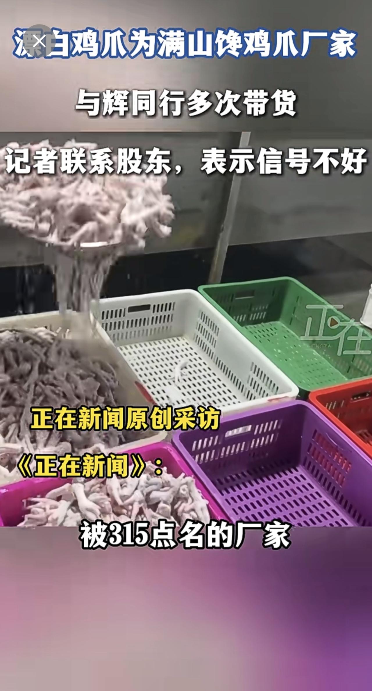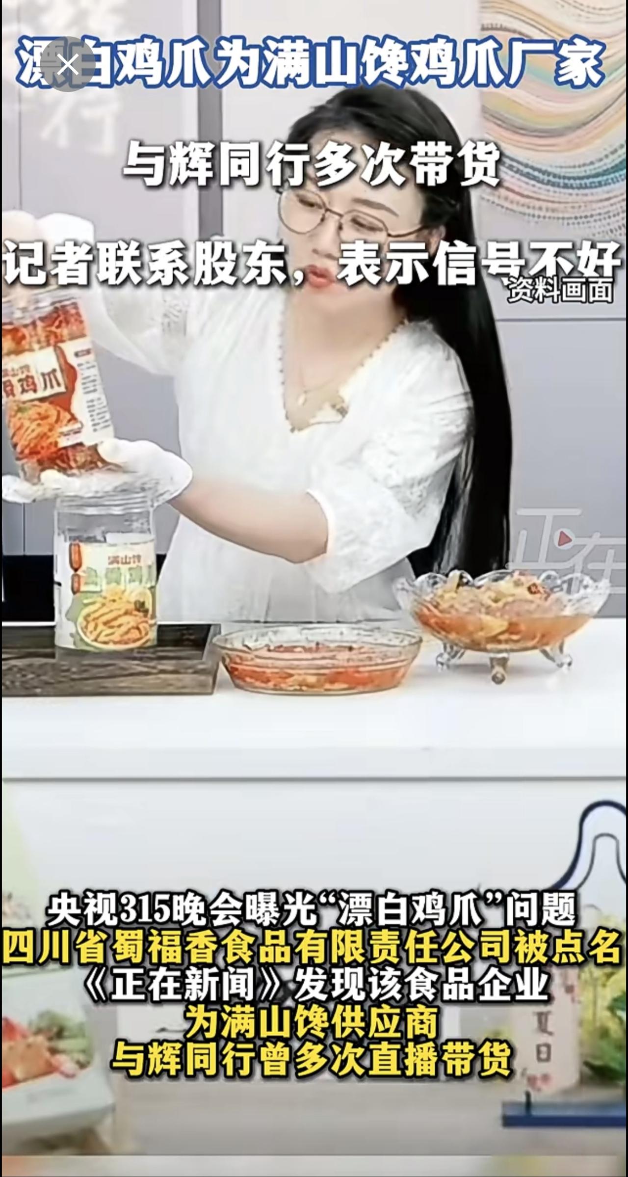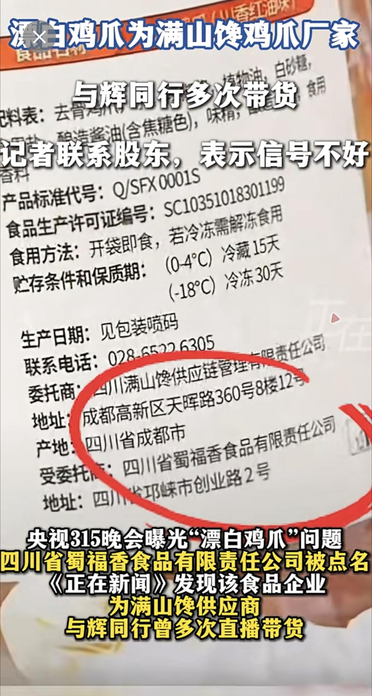 央视315晚会曝光漂白鸡爪的问题,四川省蜀福香食品有限责任公司被点名。 《正在新闻》发现,该食品企业为“满山馋”供应商,与辉同行直播间多次带货。 《正在新闻》联系四川满山馋供应链管理有限责任公司股东张先生,张先生对记者表示“信号不好”,随后挂断电话。 截止至发稿前,记者多次拨打张先生电话,再未拨通。315 与辉同行