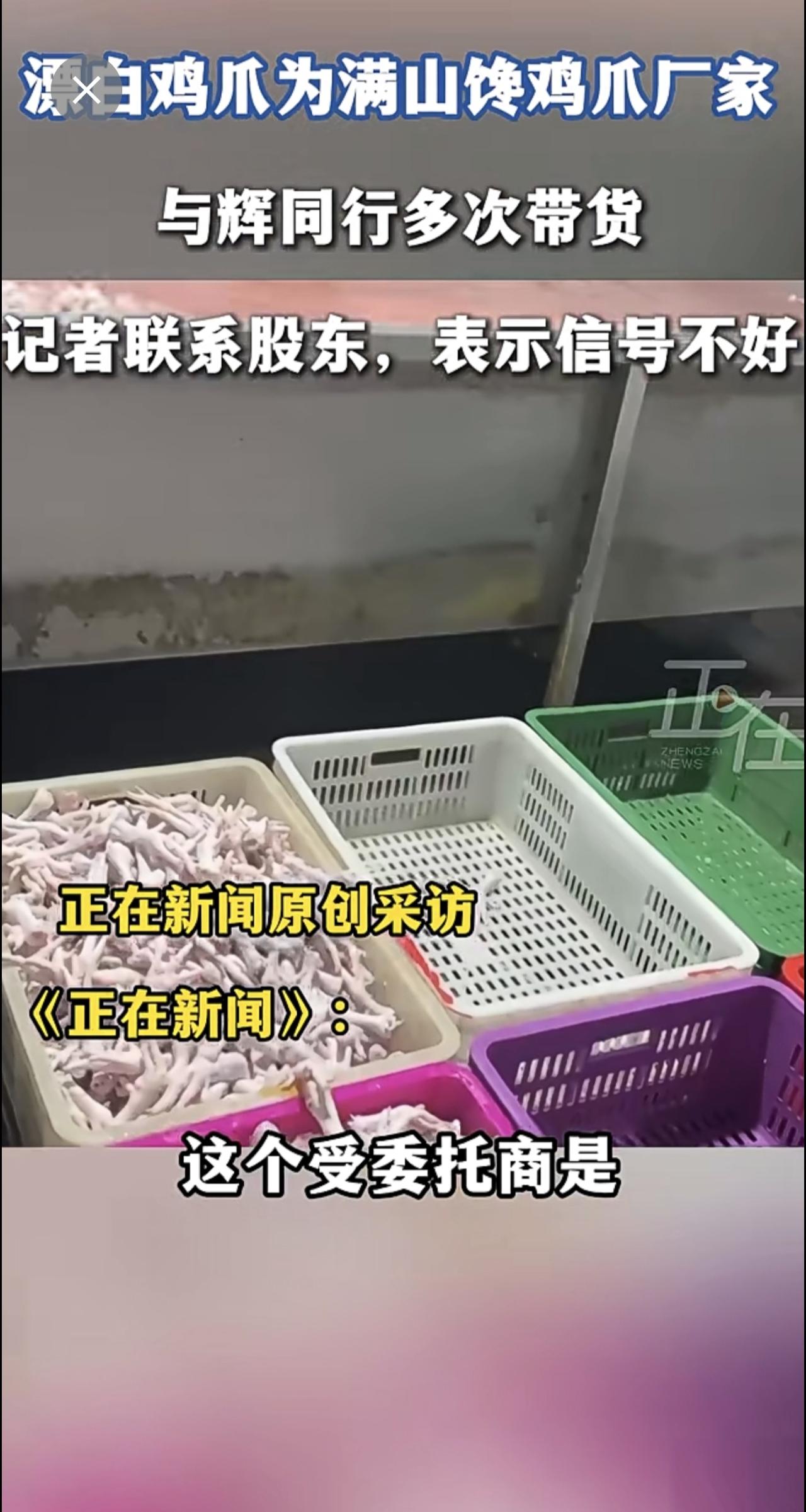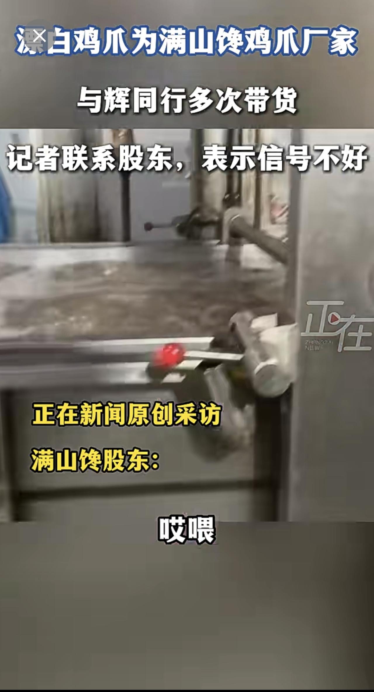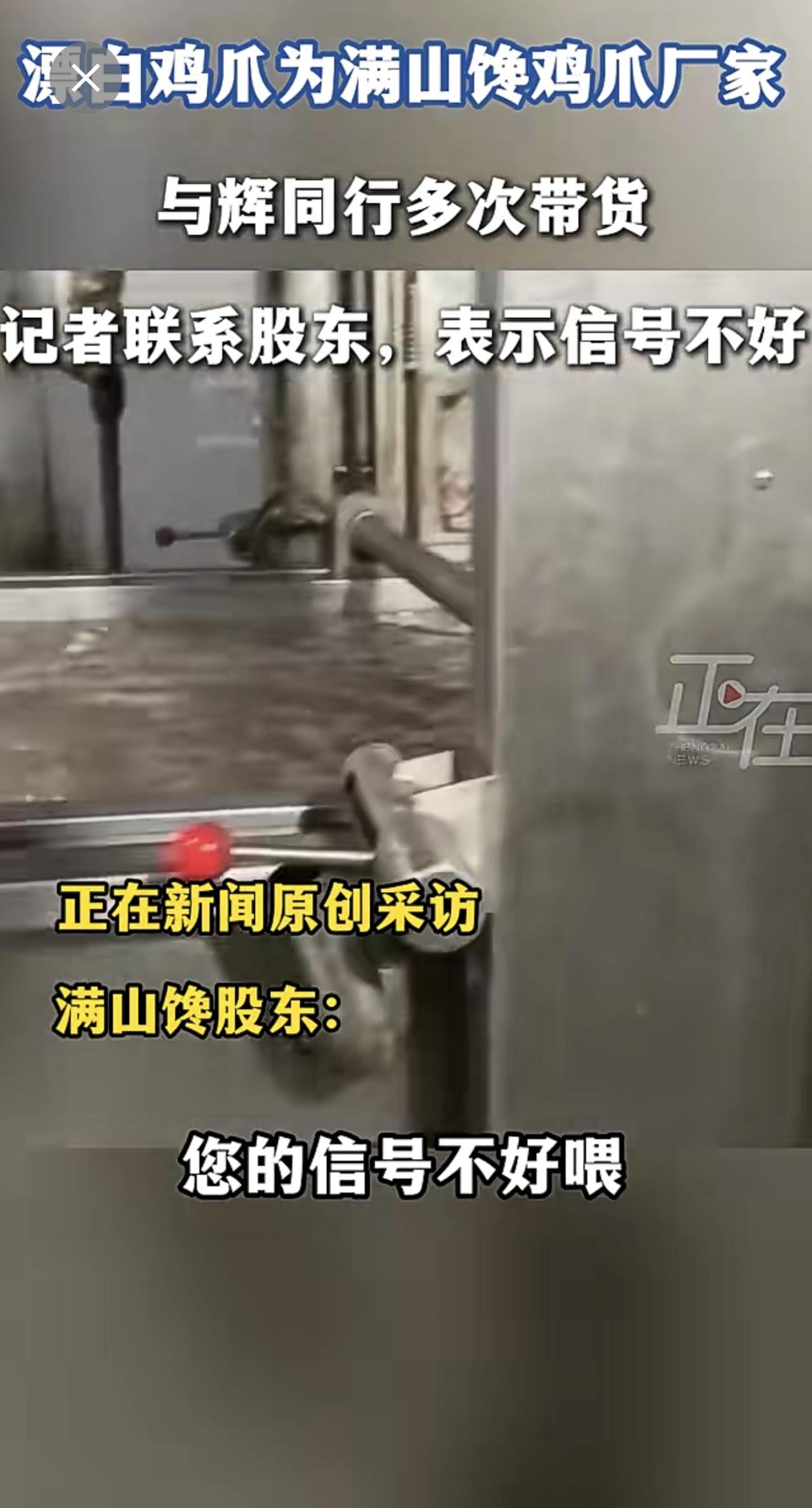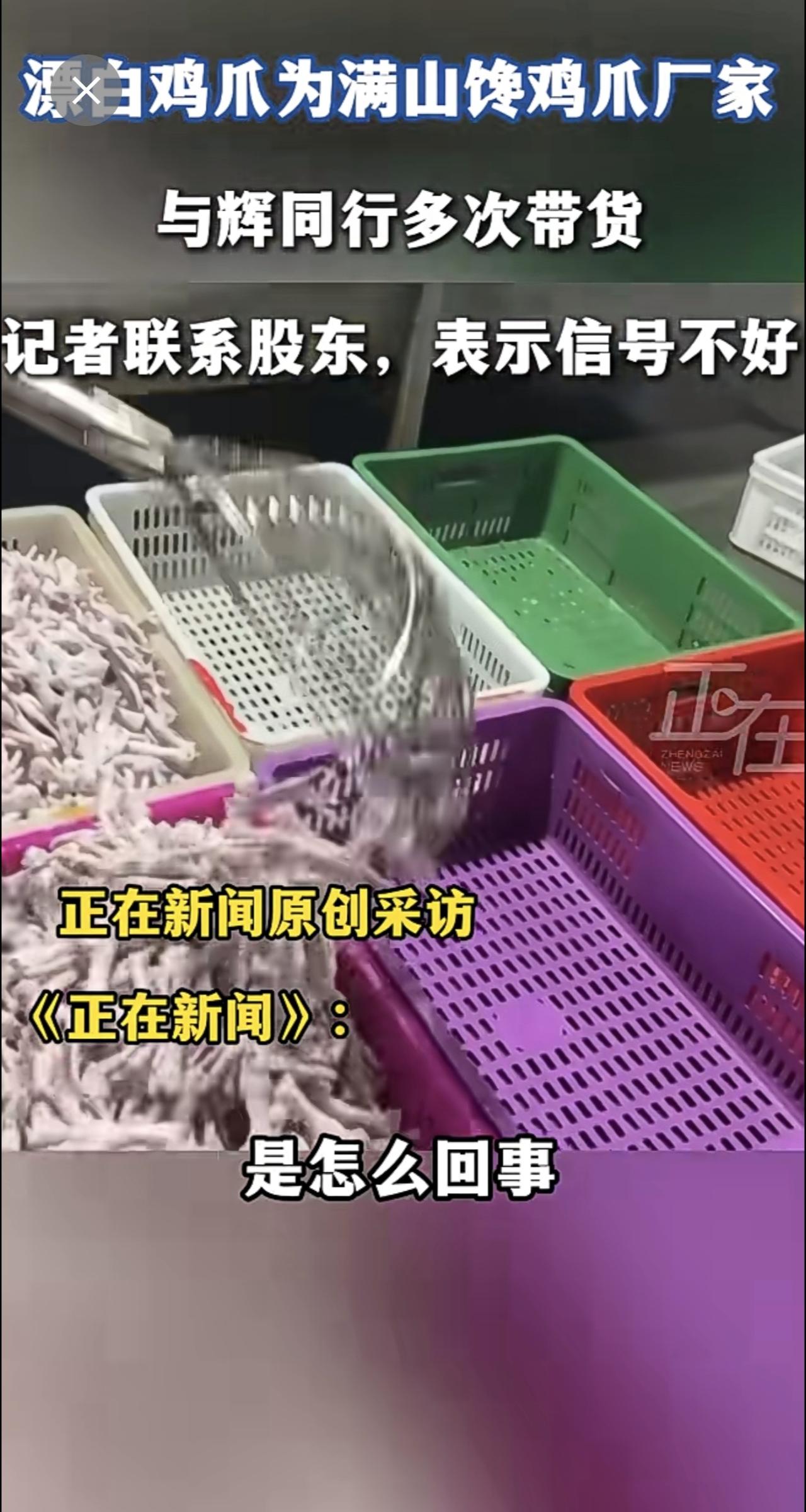 央视315晚会曝光漂白鸡爪的问题,四川省蜀福香食品有限责任公司被点名。 《正在新闻》发现,该食品企业为“满山馋”供应商,与辉同行直播间多次带货。 《正在新闻》联系四川满山馋供应链管理有限责任公司股东张先生,张先生对记者表示“信号不好”,随后挂断电话。 截止至发稿前,记者多次拨打张先生电话,再未拨通。315 与辉同行