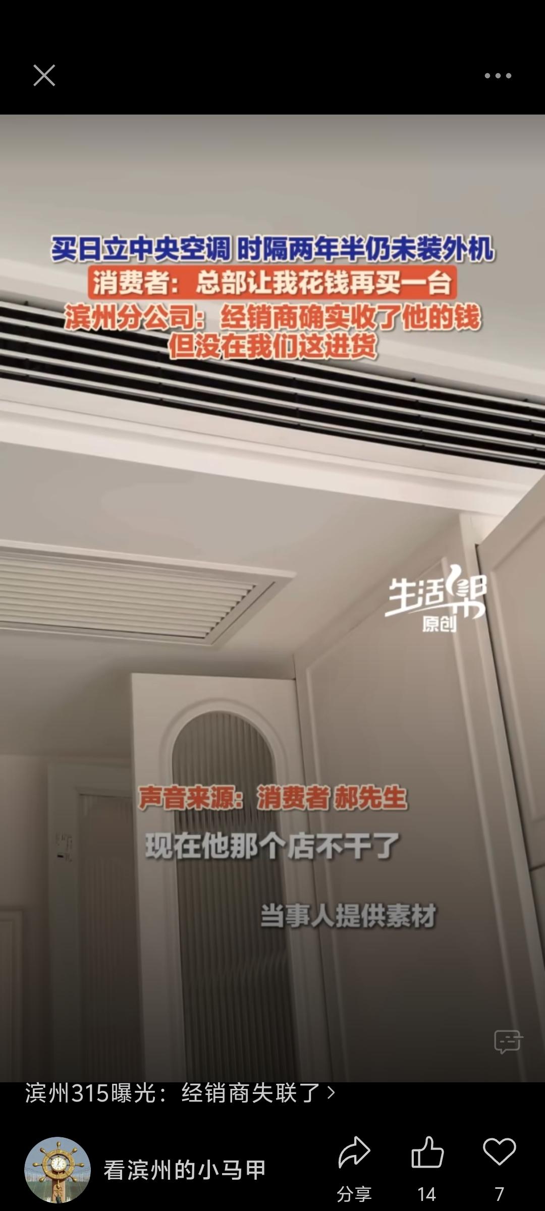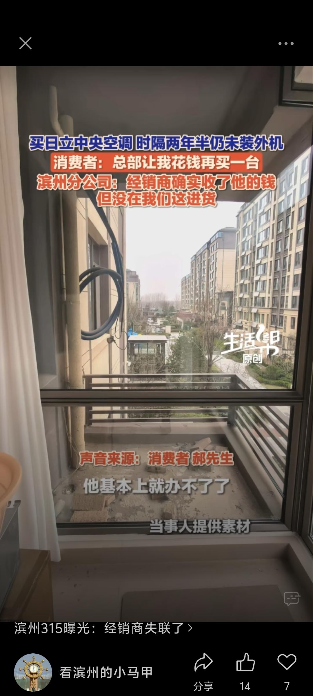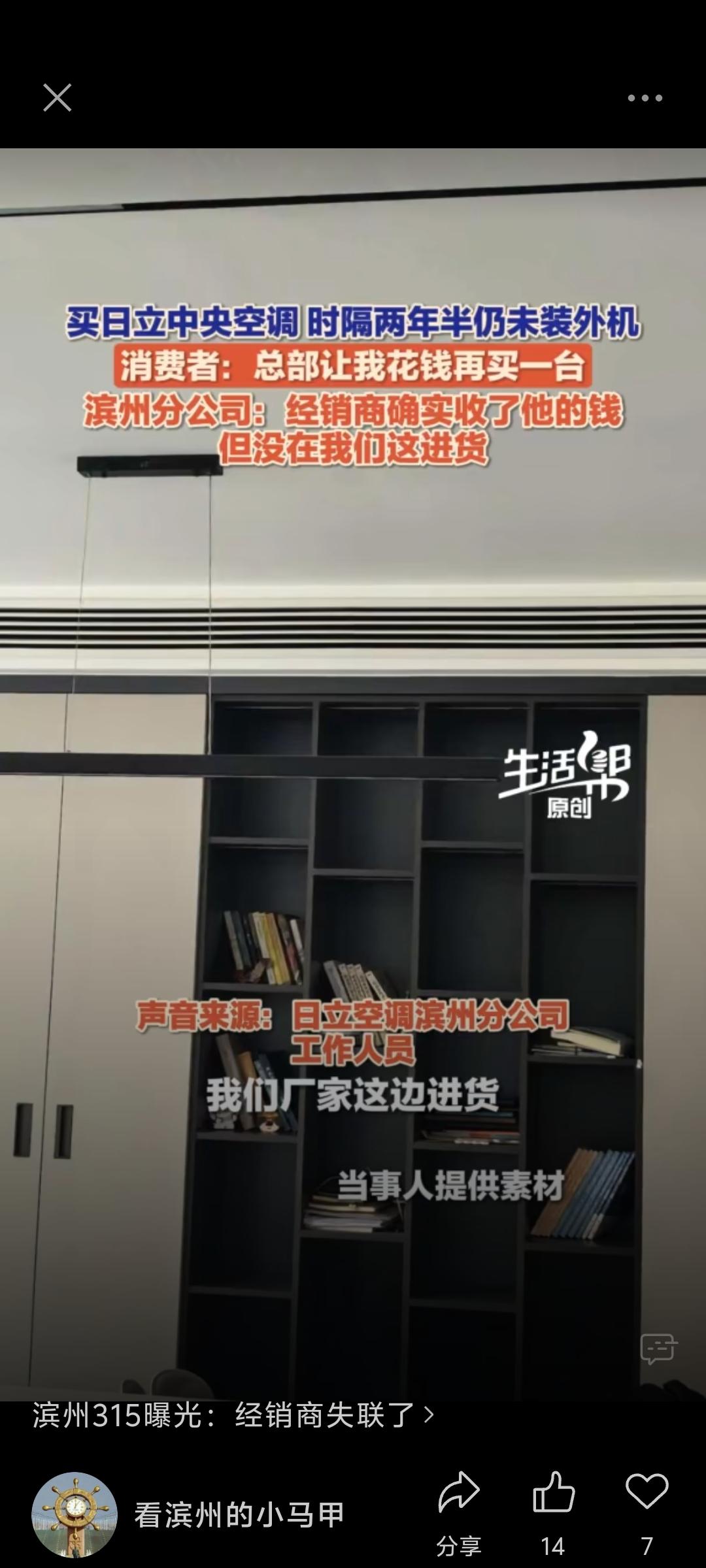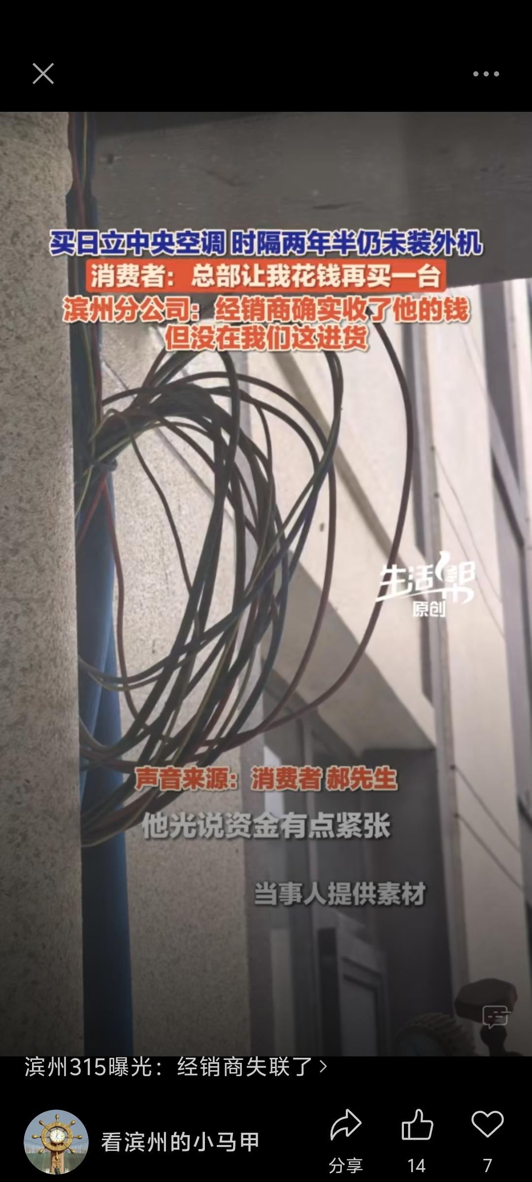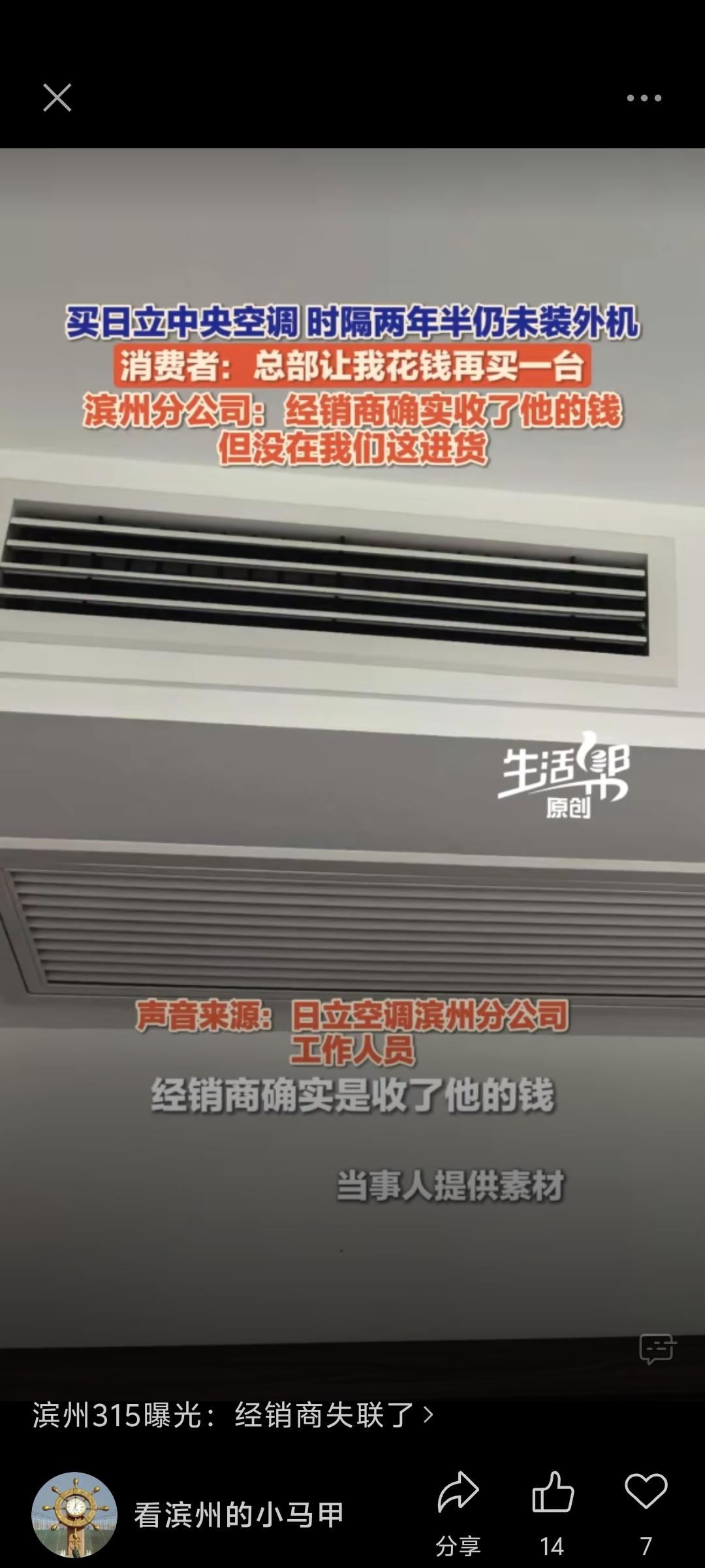 糟心!滨州博兴市民买中央空调遇经销商跑路,内机装完外机没着落 2026年3月15日,山东滨州,博兴郝先生的消费维权事件被曝光。2023年,郝先生花费51000元购买日立中央空调,按商家要求一次性付清全款后,仅完成内机安装,外机却迟迟未到位。商家以资金紧张为由拖延,至2024年店铺关停、老板失联。 郝先生联系日立空调总部得知,经销商未将货款支付给厂家,厂家因此无法提供外机,建议其自费另行购买。 帮办多次联系失联经销商无果,随后致电日立空调滨州分公司,工作人员给出两种解决方案:一是经销商出具欠条,消费者以成本价购买外机;二是厂家协助联系经销商督促处理,但均未获得郝先生认可。 目前,日立空调总部已表示会上报情况,进一步推进问题解决。 来源 综合山东台生活帮
