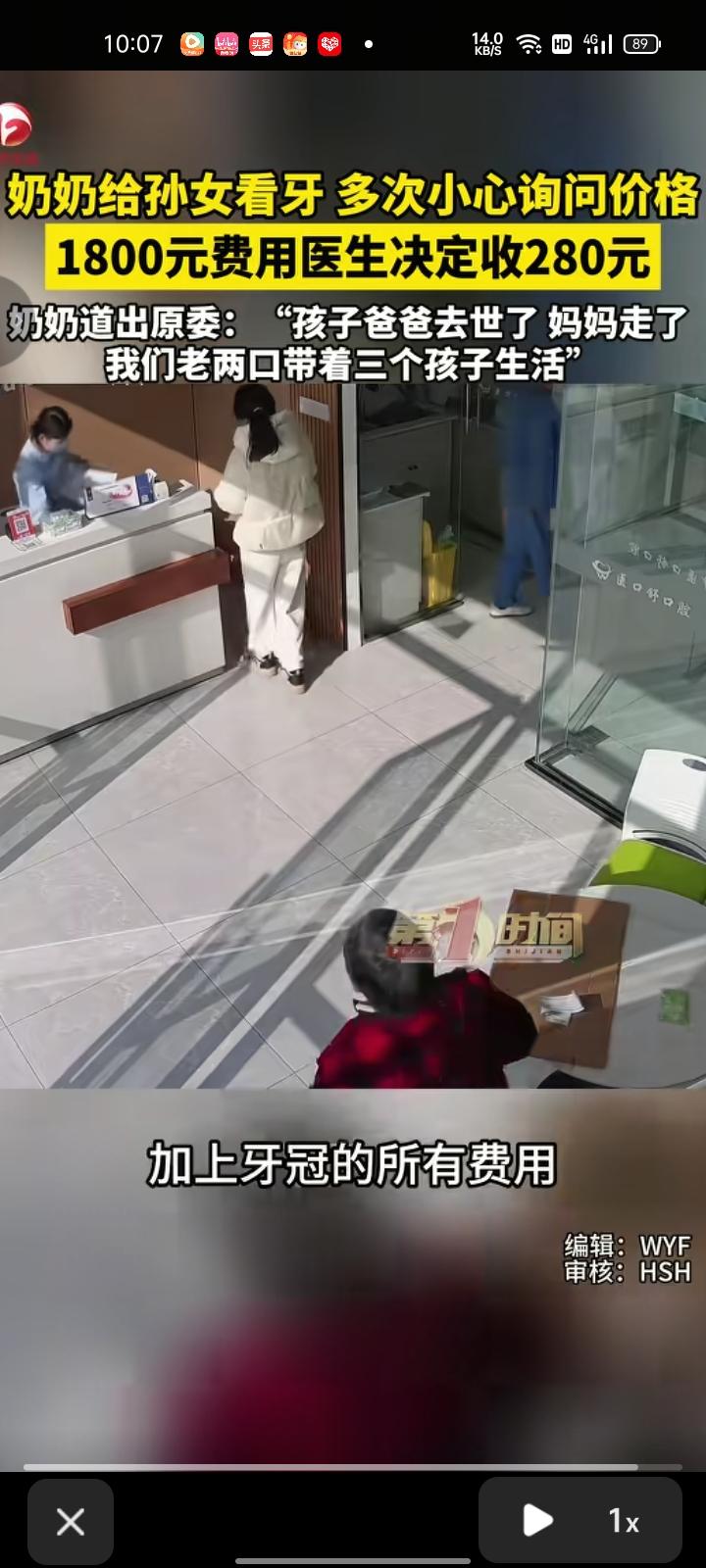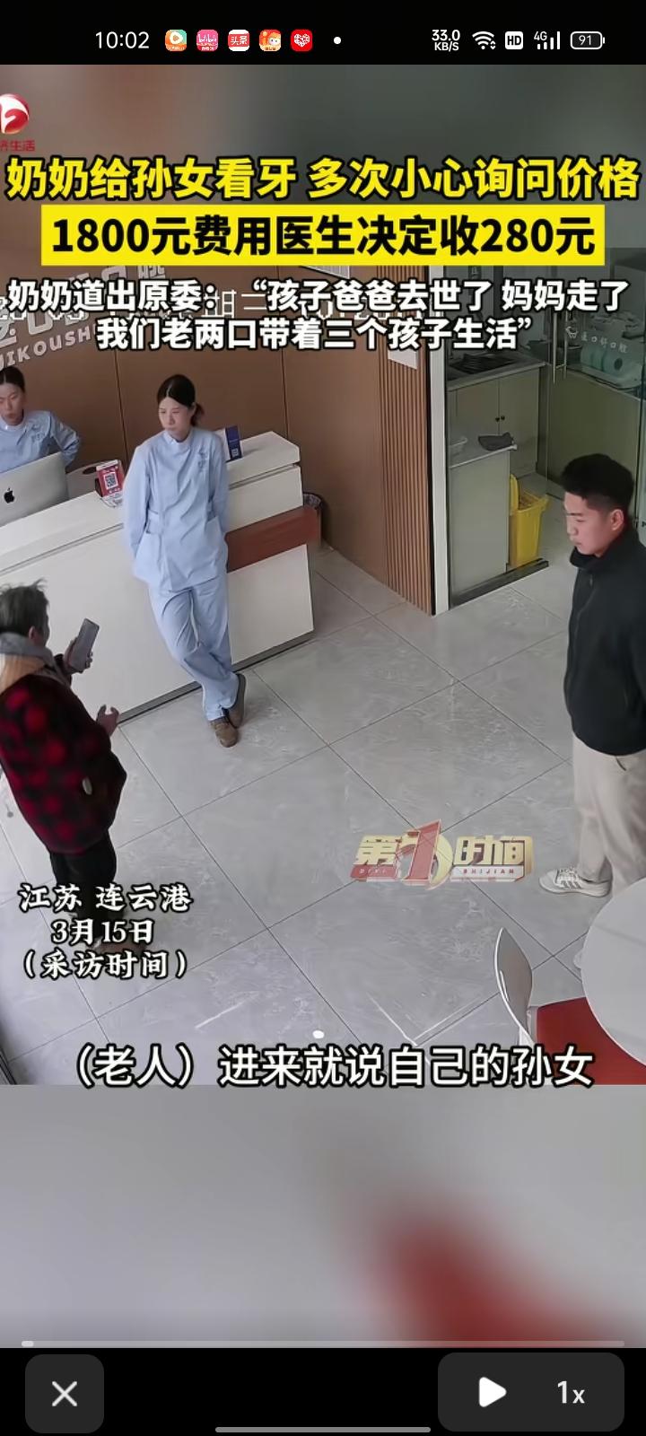 3月11日,江苏连云港。奶奶给自己的孙女看牙,小心翼翼的询问价格,牙医解释称把孩子带过来才能确认是什么症状。次日,奶奶把自己的孙女带来了,经牙医诊断,她孙女患有慢性牙髓炎,需要根管治疗,总体价格为1800元。 随后,孩子奶奶道出事情原委,孩子爸爸去世了,妈妈三年前就走了,家里有三个孩子和老伴。医生得知情况后,决定收280元,治疗费用和加上牙冠的所有费用都包含在内