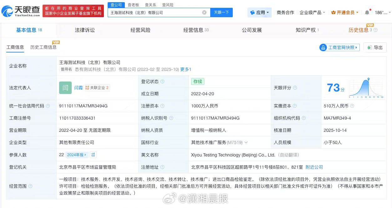天眼查App显示,“王海测评”关联王海测试科技(北京)有限公司成立于2022年4月,法定代表人为闫霞,注册资本1000万人民币,经营范围包括进出口商品检验鉴定、检验检测服务等。股东信息显示,该公司由王海法律咨询(北京)有限公司、王海共同持股。值得注意的是,王海为该公司实际控制人。公开信息显示,王海被称为“中国打假第一人”。
